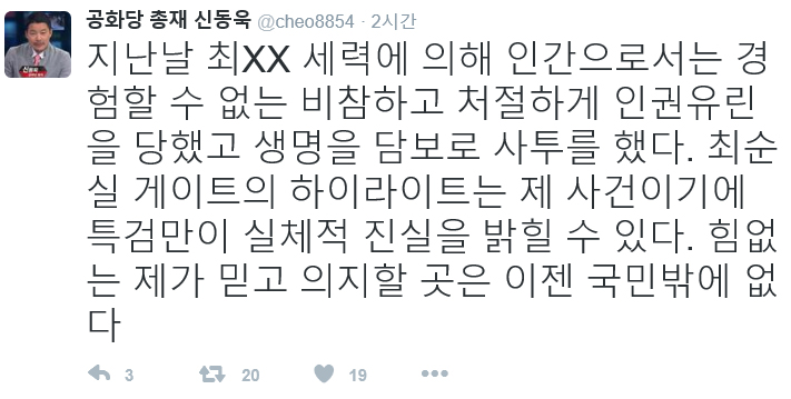 신동욱 총재는 18일 자신의 트위터에 “지난날 최XX 세력에 의해 인간으로서는 경험할 수 없는 비참하고 처절하게 인권유린을 당했고 생명을 담보로 사투를 했다”며 “최순실 게이트의 하이라이트는 제 사건이기에 특검만이 실체적 진실을 밝힐 수 있다. 힘없는 제가 믿고 의지할 곳은 이젠 국민밖에 없다”고 썼다.