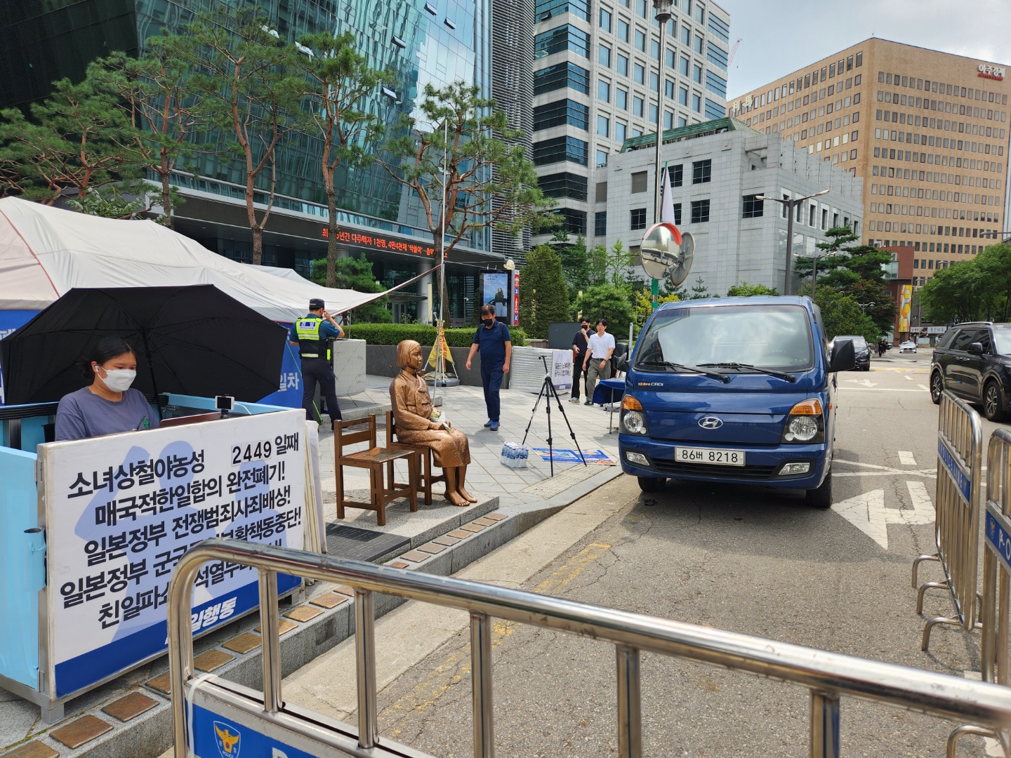 보수단체 ‘신자유연대’와 진보단체 ‘반일행동’ 간 무력 충돌이 발생한 이튿날인 12일 서울 종로구 옛 일본대사관 앞 ‘평화의 소녀상’에 경찰의 바리케이드가 설치된 와중에 반일행동 회원이 천막을 치고 소녀상 자리를 지키고 있다.<br>곽소영 기자