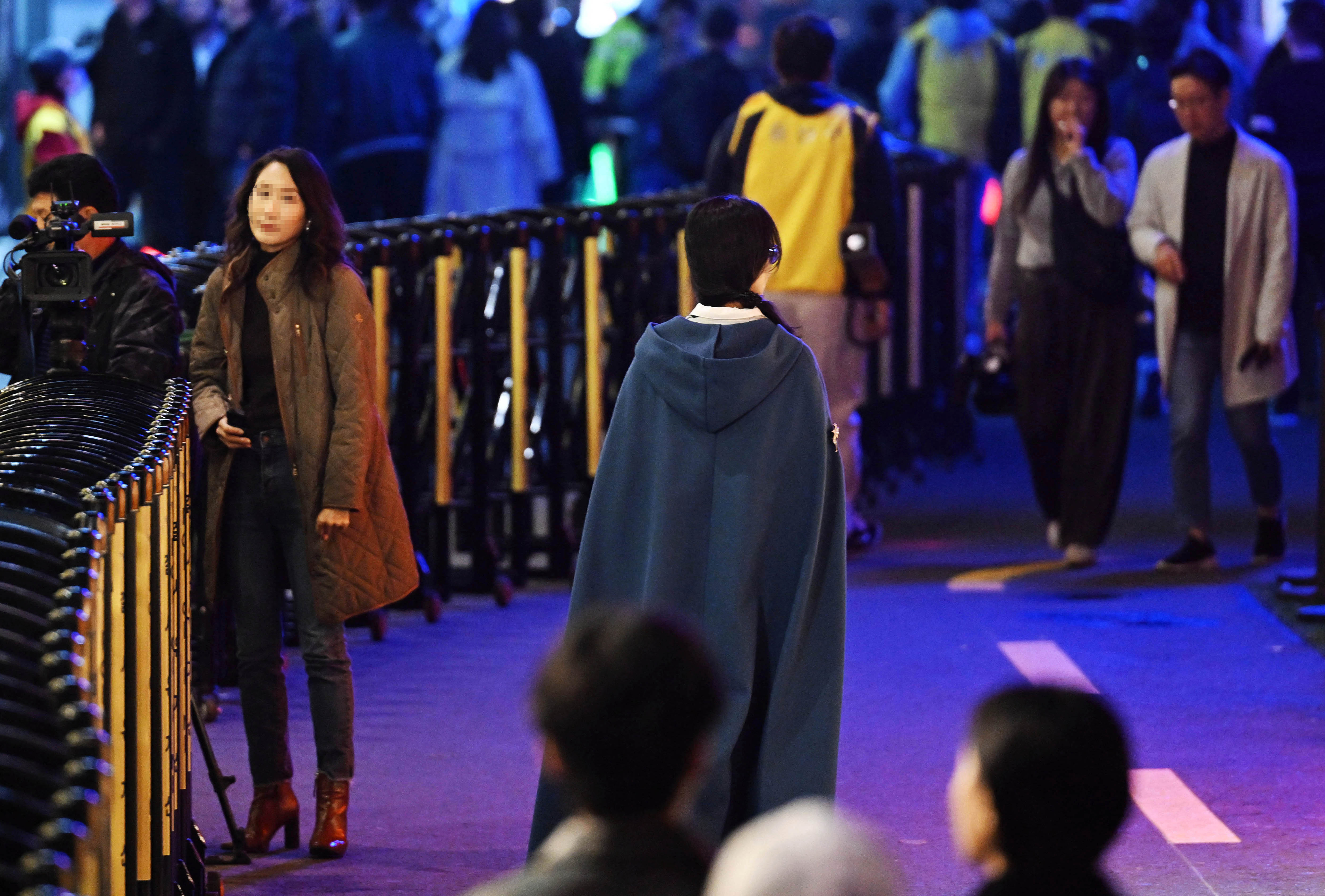 10.29 이태원 참사 1주기를 하루 앞둔 28일 서울 용산구 이태원 거리에서 망토를 입은 한 시민이 펜스를 따라 이동하고 있다.