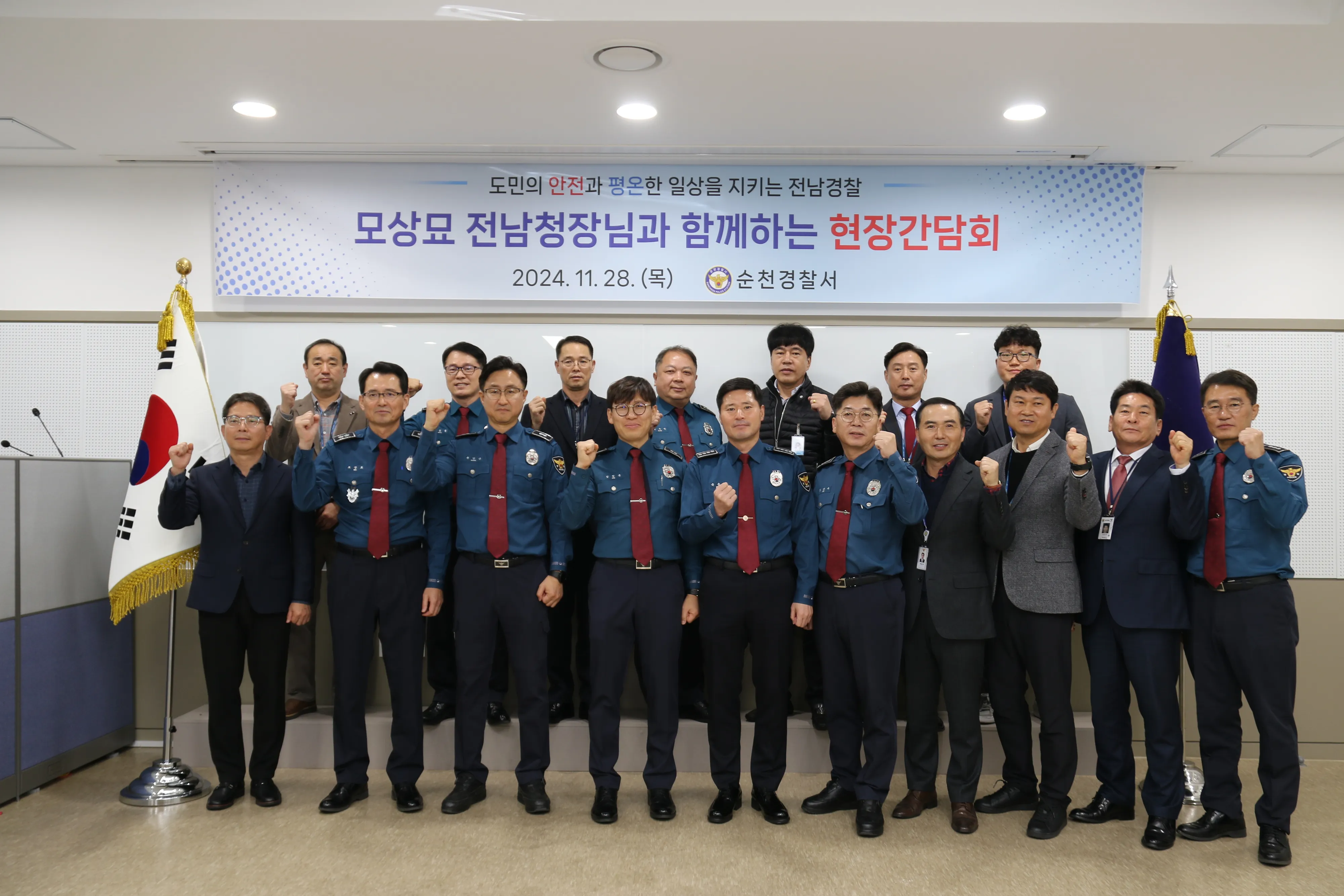 모상묘 전남경찰청장이 지난달 28일 순천경찰서를 방문해 현장간담회와 유공 경찰관 포상 후 직원들과 기념사진을 찍고 있다.