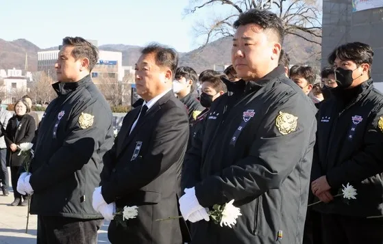 무안 제주항공 참사 사흘째인 31일 광주 동구 5·18민주광장에 마련된 합동 분향소에서 최준영(가운데) KIA 타이거즈 대표이사와 심재학(왼쪽) 단장, 이범호(오른쪽) 감독 등이 헌화를 위해 기다리고 있다. 광주 뉴스1