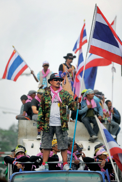 또 하나의 화약고 방콕… 6세 여아도 희생  태국 반정부 시위대가 24일 수도 방콕에 있는 외무부 청사 앞 차량 위에 올라가 있다. 시위대는 지난 1월 초부터 방콕 중심부 주요 교차로를 봉쇄했다. 시위대에 전날 가해진 폭탄 공격으로 6세 여자 어린이가 숨지는 등 지난해 11월 탁신 친나왓 전 총리 세력의 퇴진을 요구하는 반정부 시위 발발 이후 지금까지 20명이 숨지고 700여명이 다쳤다.<br>방콕 AFP 연합뉴스