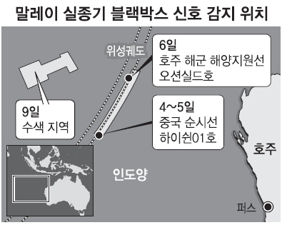 AP통신은 9일 호주 해군 오션실드호가 블랙박스에서 나오는 것으로 추정되는 신호를 전날 오후와 저녁에 두 차례 감지했다고 보도했다. 첫 번째 신호는 5분 32초간, 두 번째 신호는 7분간 지속됐다. 신호는 호주 서부도시 퍼스로부터 북서쪽으로 1645㎞ 떨어진 곳에서 감지됐다. 앞서 지난 4~5일에는 중국 순시선 하이쉰1호가, 6일에는 오션실드호가 블랙박스에서 나오는 것으로 추정되는 신호를 감지했다.