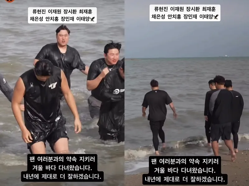 한화 선수들은 이날 서해에서 단체 입수를 한 것으로 전해졌다. 겨울 바다 입수는 한화가 개막 전 가을야구 진출 의지를 담아 했던 약속이다. 개막 미디어데이 당시 주장 채은성은 “5위 안에 들지 못하면 고참 선수들이 태안 앞바다에 입수하기로 했다”고 말했다.