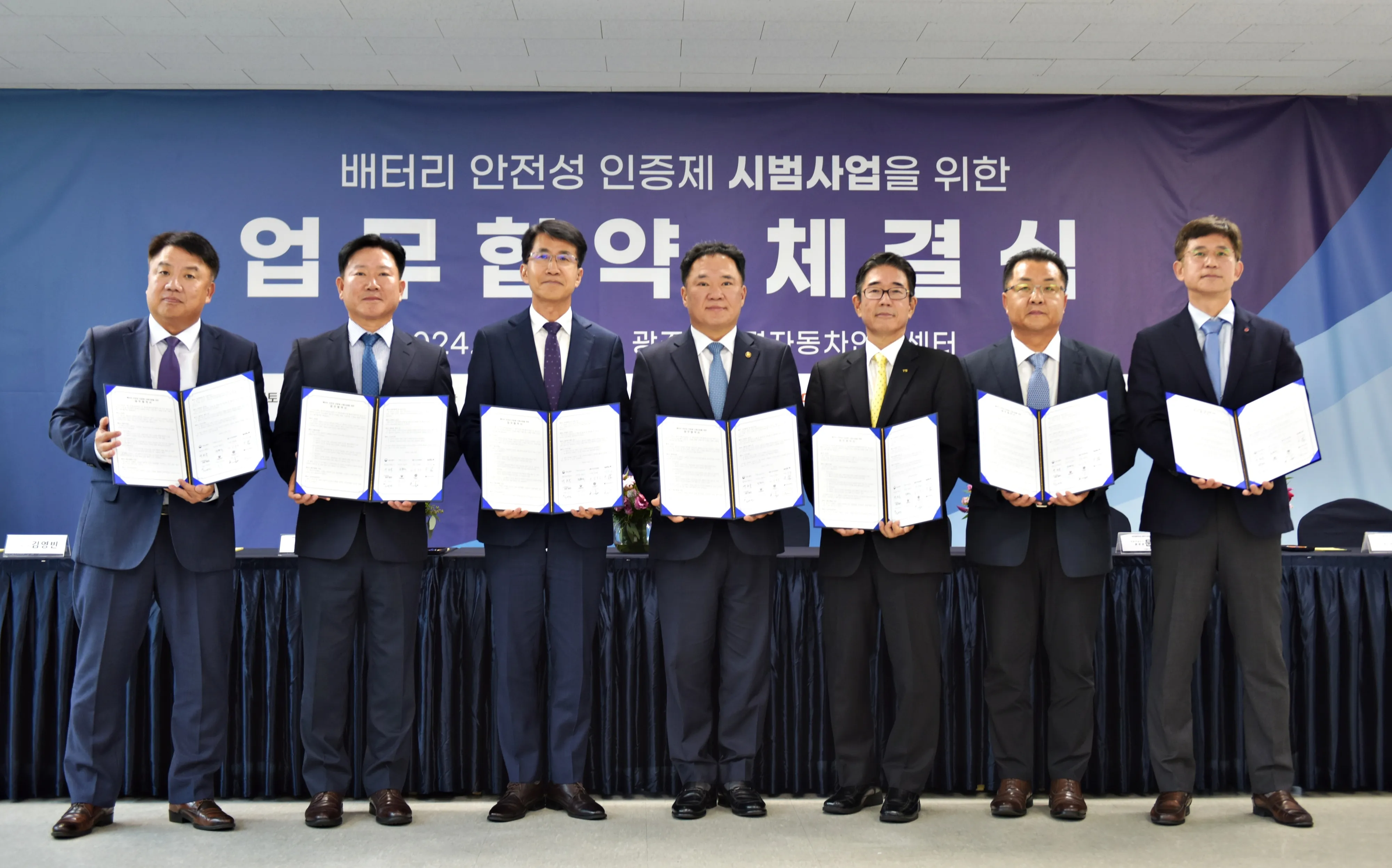 현대차그룹은 15일 광주 빛그린 산업단지에 위치한 자동차안전연구원 친환경 자동차·부품 인증센터에서 백원국 국토교통부 제2차관, 김동욱 현대차그룹 부사장 등 주요 관계자들이 참석한 가운데 ‘배터리 안전성 인증제’ 시범사업 실시를 위한 업무협약을 체결했다고 이날 밝혔다.