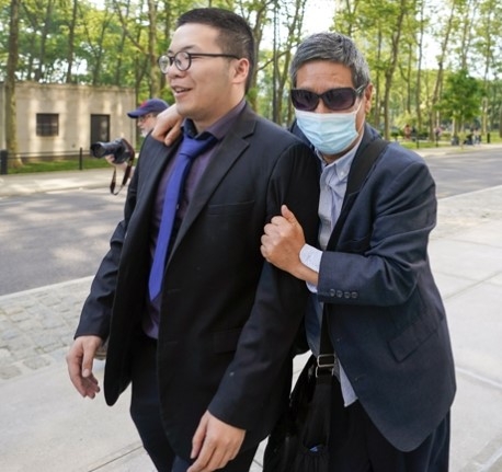 지난달 31일 미국 뉴욕 브루클린 연방지방법원에서 ‘여우사냥’ 관련자인 주융(오른쪽)이 기자들로부터 자신을 보호하고 있다. 뉴욕 AP 뉴시스