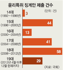 전례를 봐도 윤리특위 실적은 전무하다. 1991년 설치된 이후 제명 사례는 0건이다. 19대 국회 들어 의원들의 ‘막말’ 등으로 모두 29건의 징계안이 국회에 제출됐지만 최종 징계가 결정난 건은 없다. 정치권 안팎에서 “윤리특위가 정쟁의 도구이자 의원 망신주기용으로 변질됐다”는 목소리가 끊이지 않고 있다.