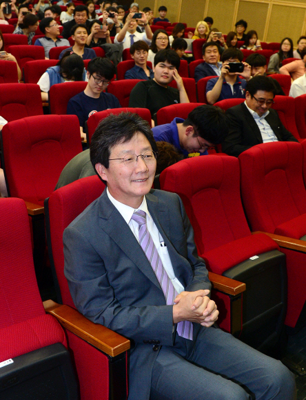 유승민 의원이 31일 성균관대 법학관에서 ’경제위기와 정치의 역할’을 주제로 강연에 나서기 위해 강의실에 앉아 있다.<br>정연호 기자 tpgod@seoul.co.kr