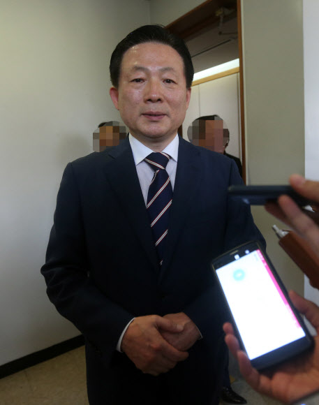 당원 단합대회를 열어 사전선거운동을 한 혐의로 불구속 기소돼 항소심에서도 당선 무효형이 선고된 자유한국당 박찬우(57·천안 갑) 의원이 18일 오후 대전고법서 열린 선고 후 취재진의 질문에 답하고 있다. 2017.9.18 연합뉴스