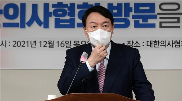 윤석열 국민의힘 대선 후보가 16일 오후 서울 용산구 대한의사협회에서 열린 코로나 대응 문제점과 개선방안에 대한 화상 간담회에 참석해 인사말하고 있다. 2021.12.16 뉴스1