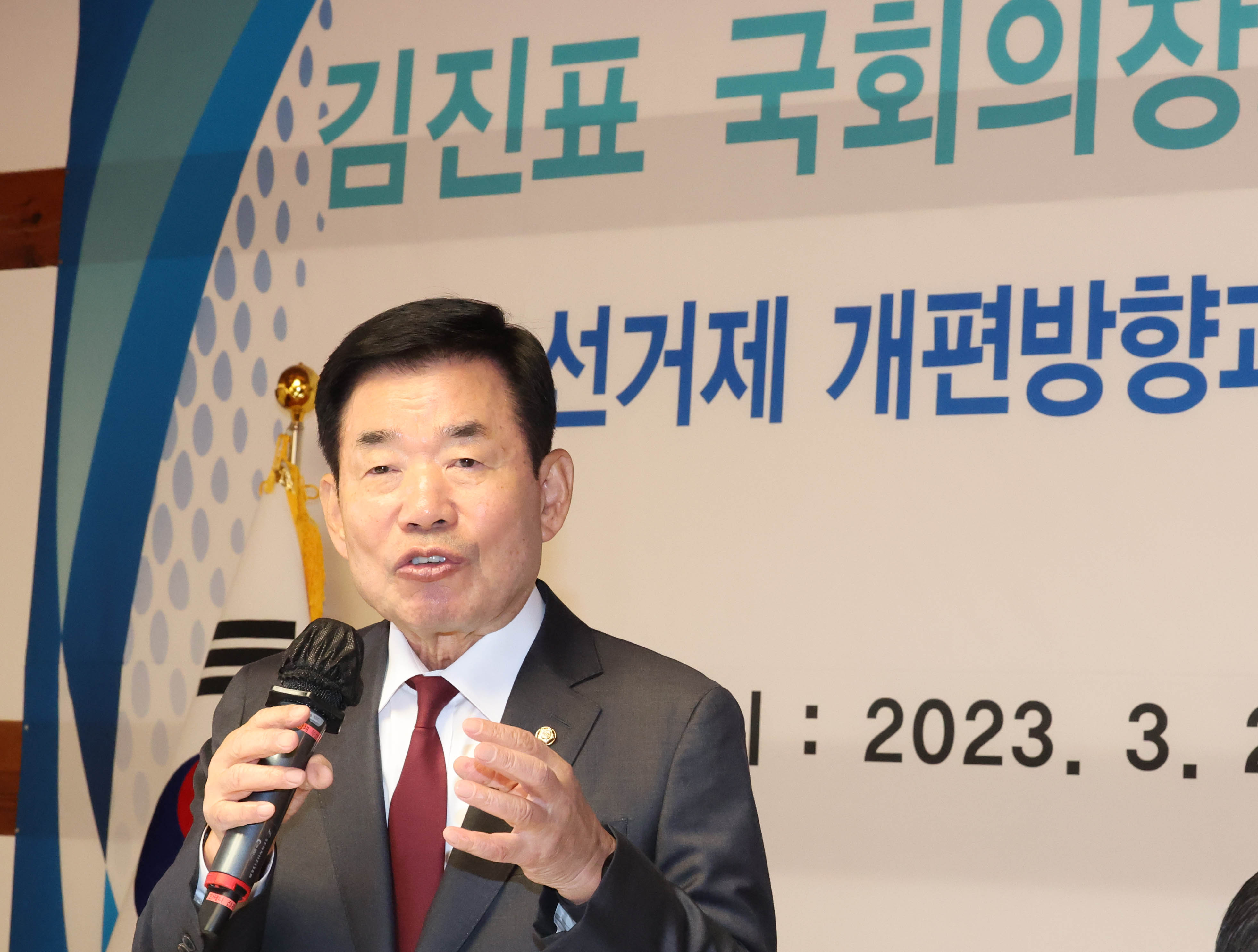 김진표 국회의장이 21일 국회 사랑재에서 열린 ‘선거제 개편방향과 전원위원회 운영계획’ 정책설명회에서 선거제 개편방향을 발표하고 있다. 연합뉴스