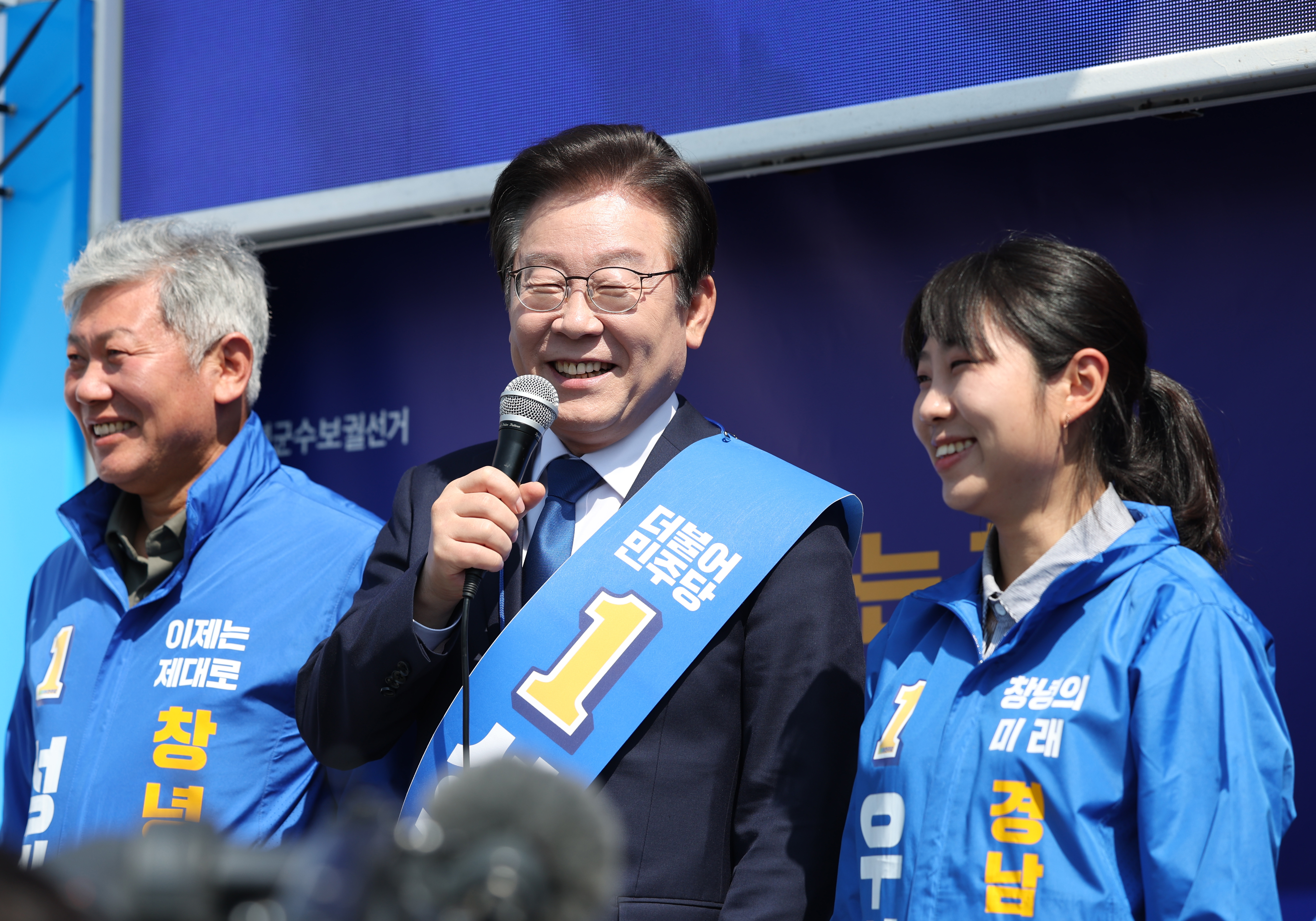 이재명 더불어민주당 대표가 28일 오전 경남 창녕군 창녕읍 남산 회전 로터리 일대에서 4·5 창녕군수 보궐선거에 출마한 같은 당 성기욱 후보와 경남도의원 창녕군 제1선거구에 출마한 우서영 후보에 대해 지지를 호소하고 있다. 왼쪽부터 성 후보, 이 대표, 우 후보. 연합뉴스