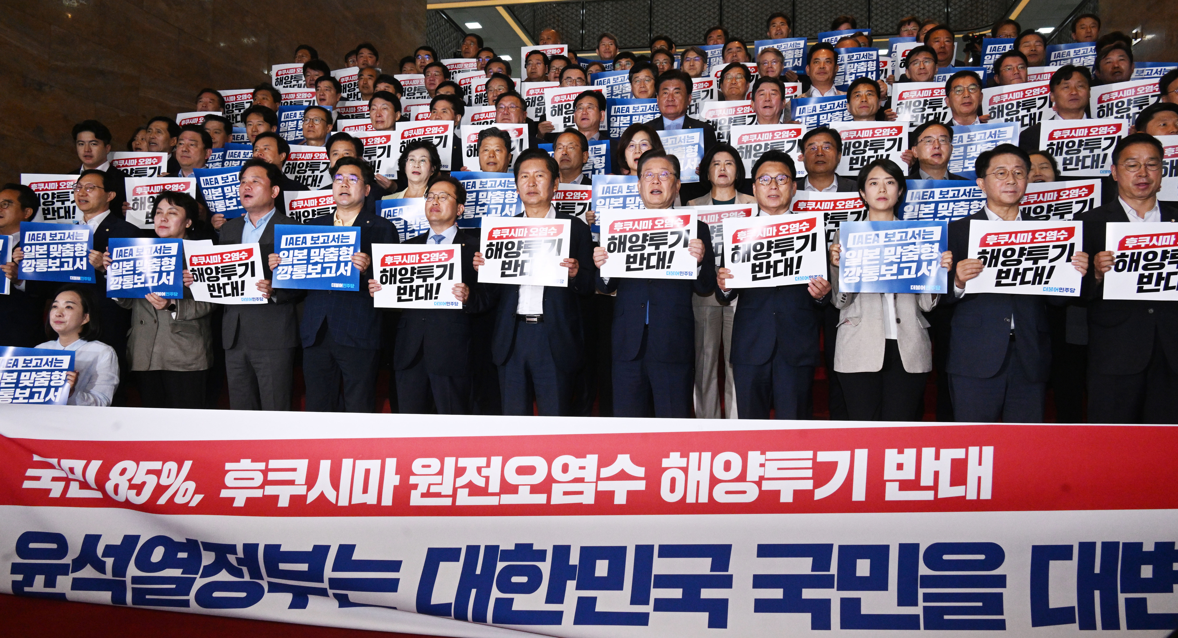 5일 더불어민주당 이재명 대표와 박광온 원내대표를 비롯한 의원들이 국회 로텐더홀 계단에서 후쿠시마 오염수 방류 저지 결의대회를 열었다.