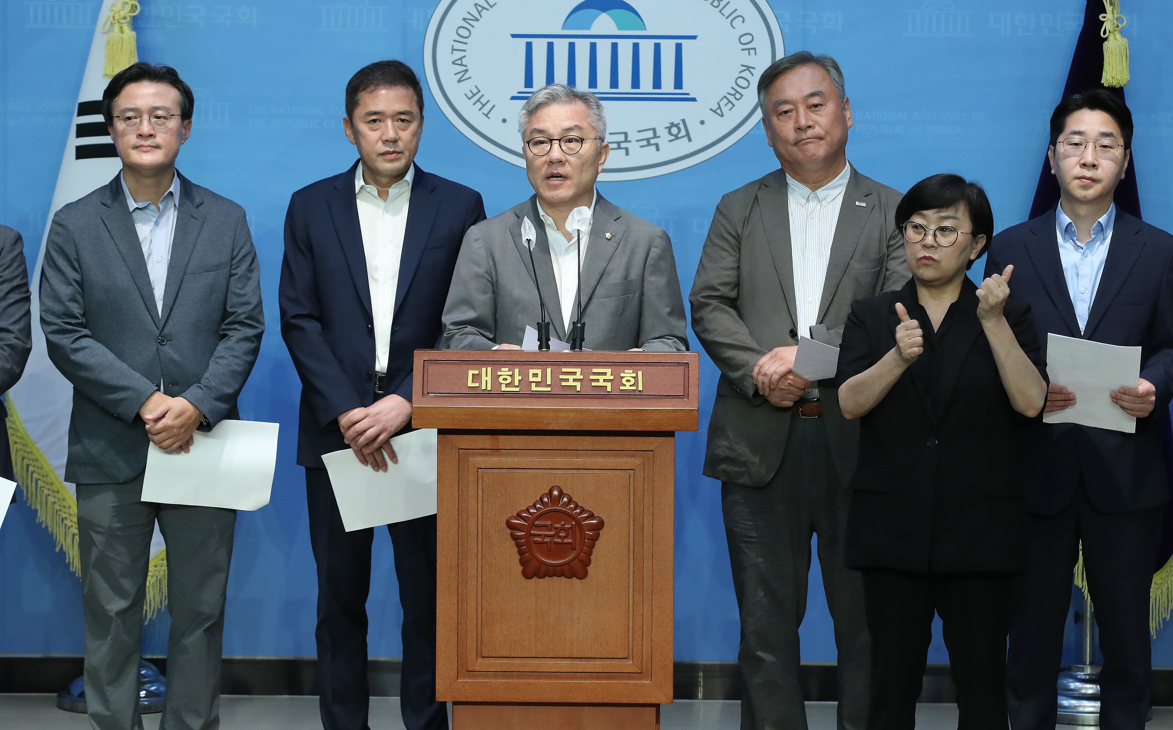 한동훈 장관 수사준칙 개정 규탄 기자회견 나선 최강욱 의원  최강욱(가운데) 더불어민주당 의원 및 더새로포럼 관계자들이 7일 오전 서울 여의도 국회 소통관에서 기자회견을 갖고 한동훈 법무부 장관의 수사준칙 개정을 규탄하고 있다.