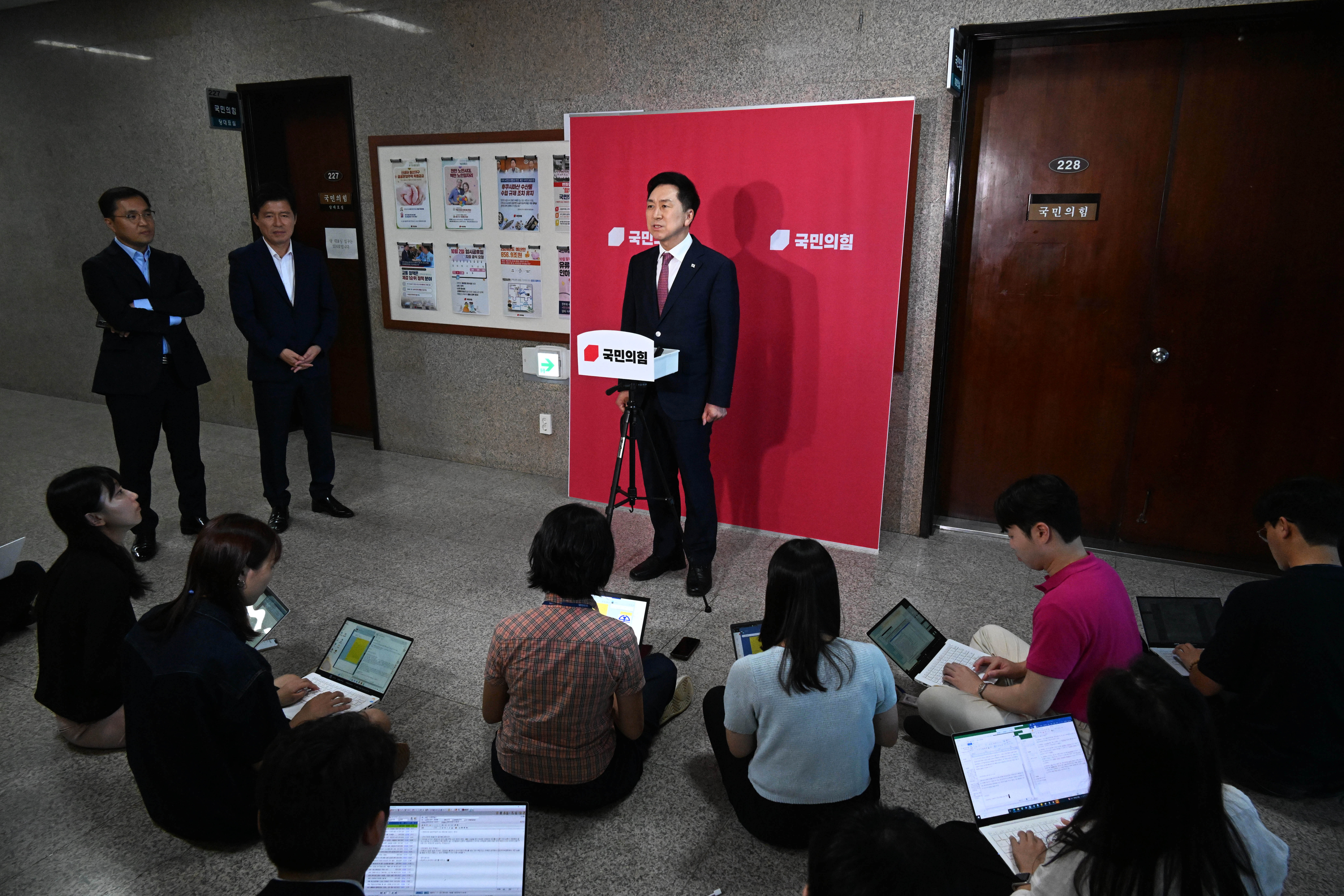 김기현 국민의힘 대표가 6일 국회에서 기자들과 만나 백브리핑하고 있다.  2023.9.6 홍윤기 기자