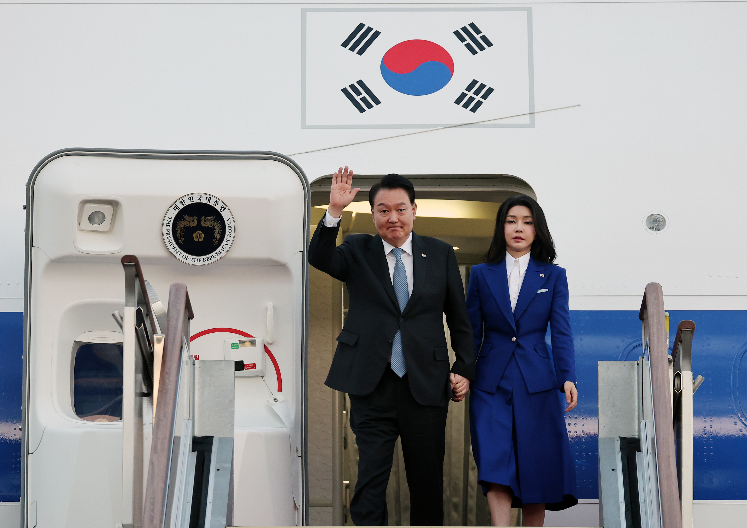 윤석열 대통령과 김건희 여사가 지난 23일 4박6일 간의 미국 방문 일정을 마치고 성남 서울공항을 통해 귀국, 전용기인 공군 1호기에서 내리며 손을 들어 인사하고 있다. 연합뉴스