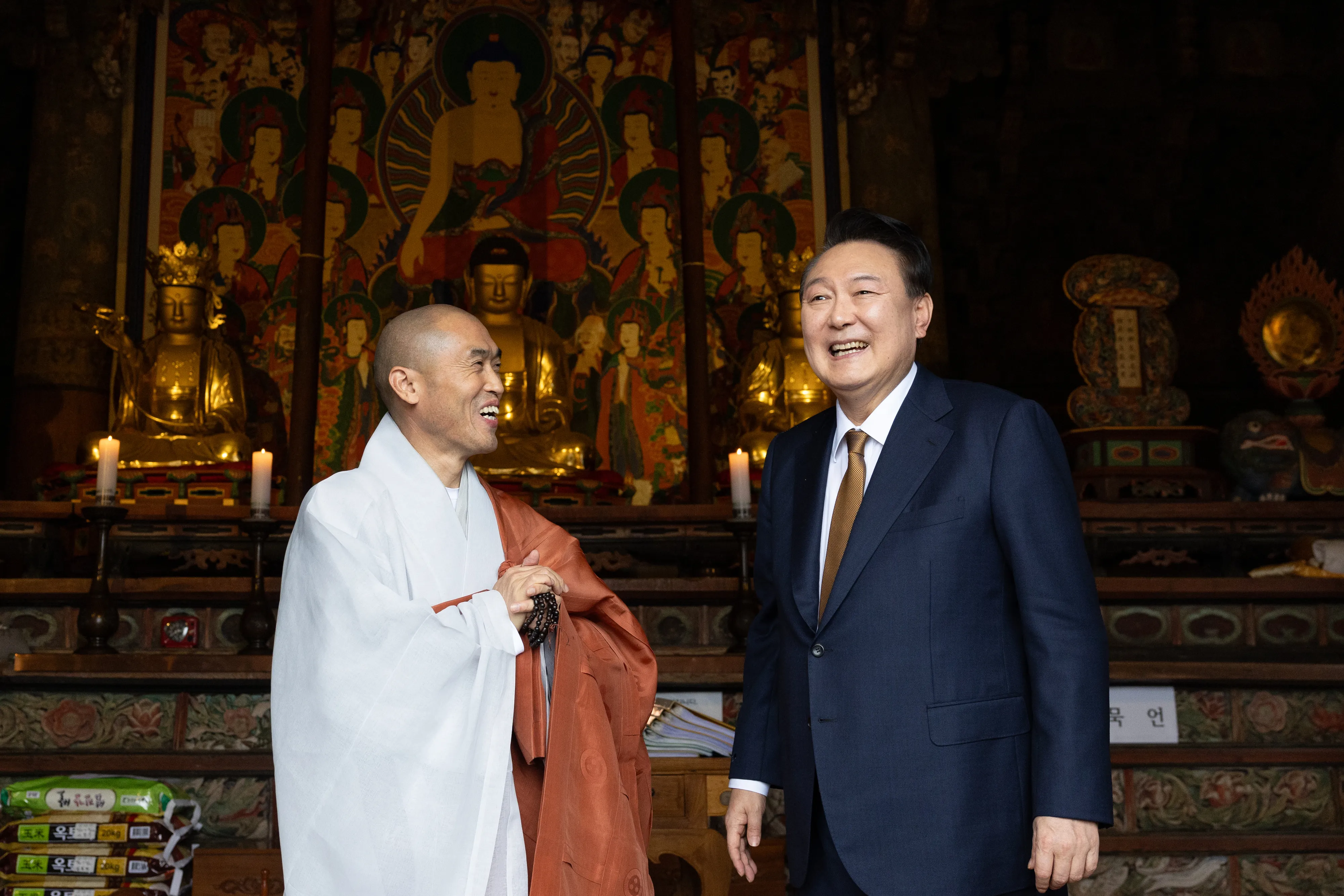 윤석열 대통령이 22일 부산 금정구 범어사를 찾아 대웅전에서 참배한 뒤 주지 정오스님과 대화하고 있다. 현직 대통령의 범어사 방문은 이승만 전 대통령에 이어 두 번째다. 부산 연합뉴스