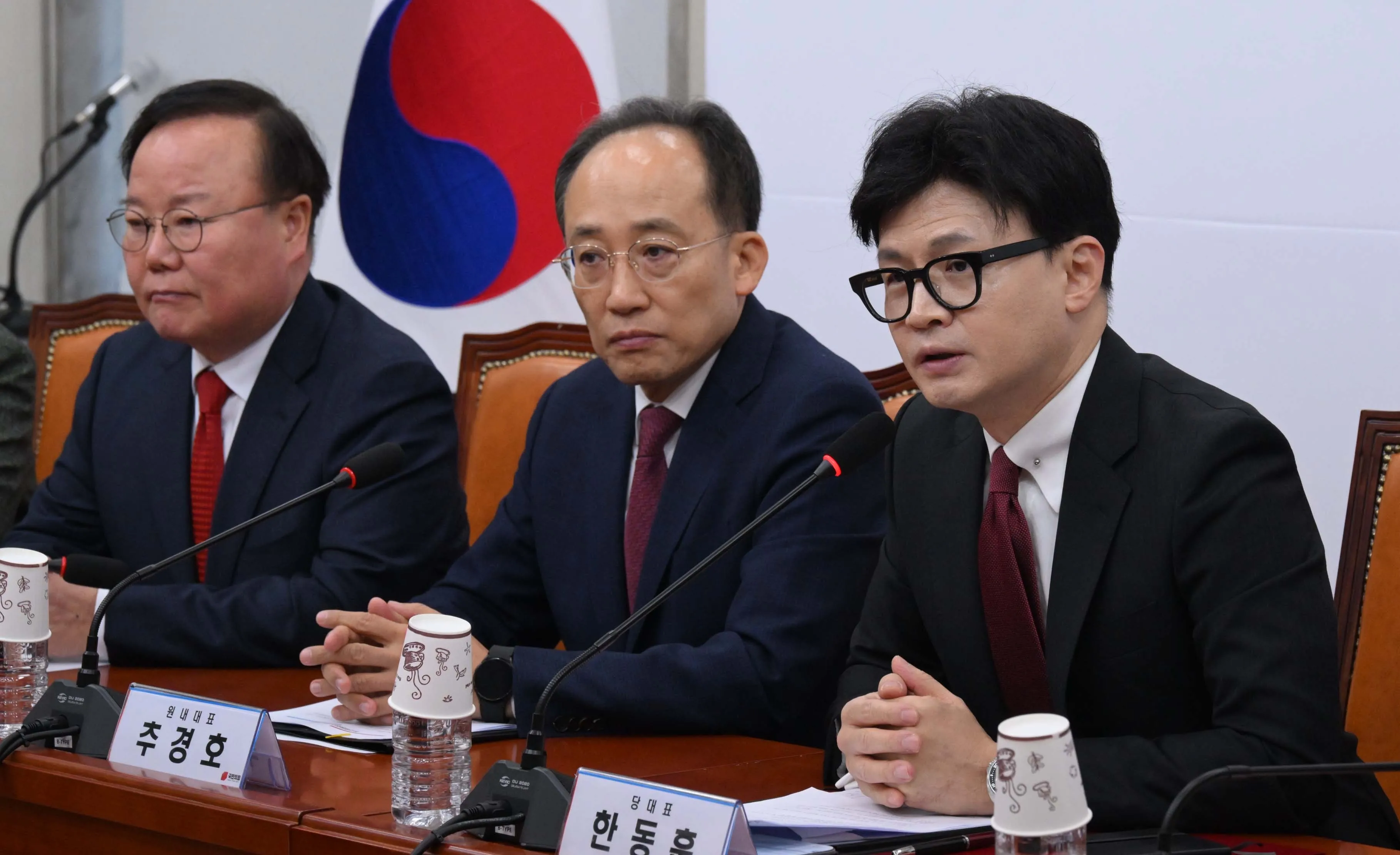 한동훈(오른쪽) 국민의힘 대표가 지난 7일 국회에서 열린 최고위원회의에서 발언 하고 있다. 왼쪽부터 김재원 국민의힘 최고위원, 추경호 원내대표, 한 대표 순.