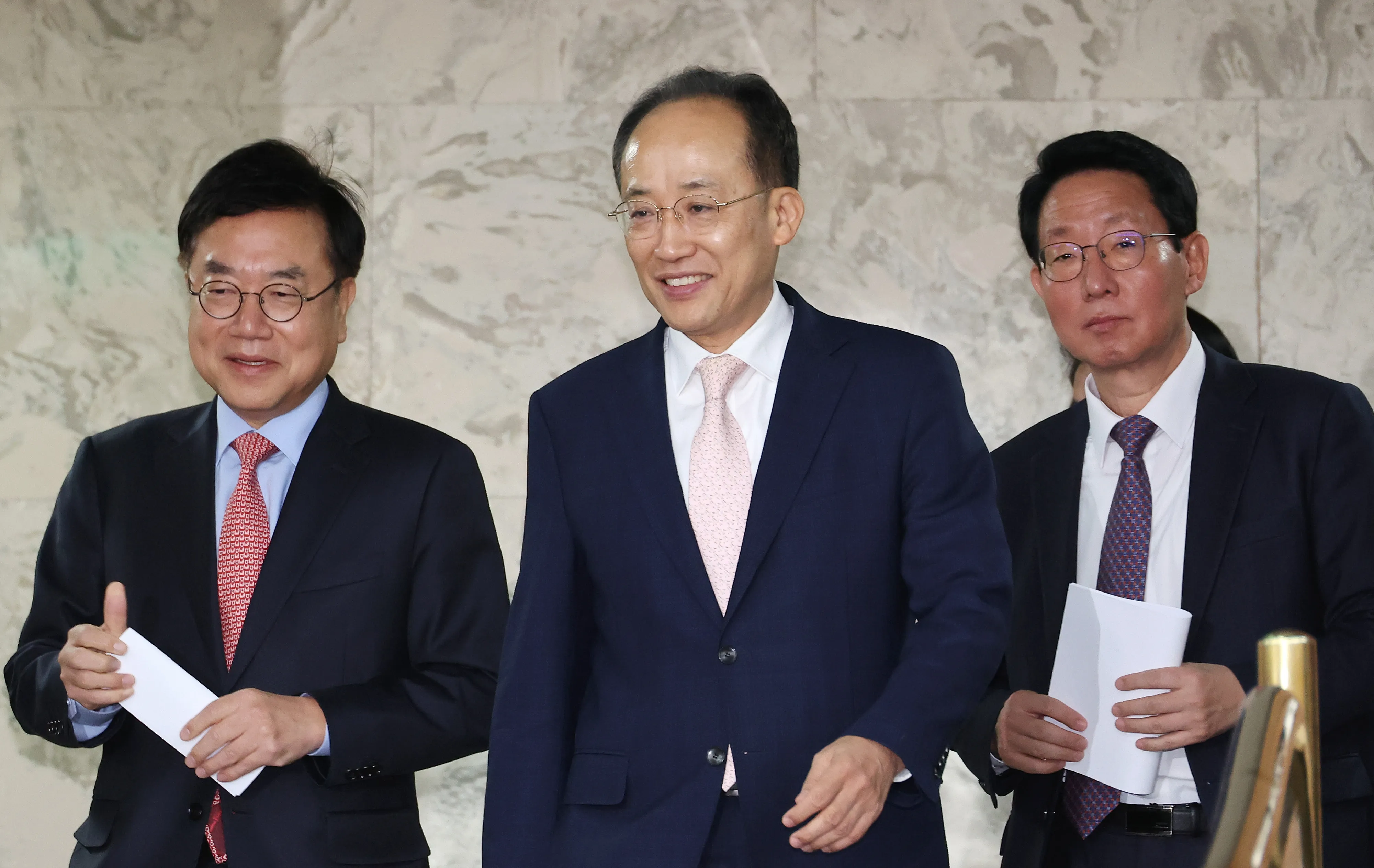 추경호(가운데) 국민의힘 원내대표가 8일 국회에서 열린 원내대책회의에 입장하고 있다.. 왼쪽부터 서범수 사무총장, 추 원내대표, 김상훈 정책위의장 순.