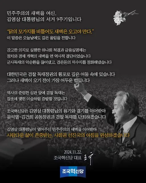 조국 조국혁신당 대표는 22일 고 김영삼(YS) 전 대통령 9주기를 맞아 “조국혁신당은 김 전 대통령의 용기와 결기를 이어받아 ‘윤석열·김건희 공동정권과 검찰 독재를 단죄하겠다”고 밝혔다.