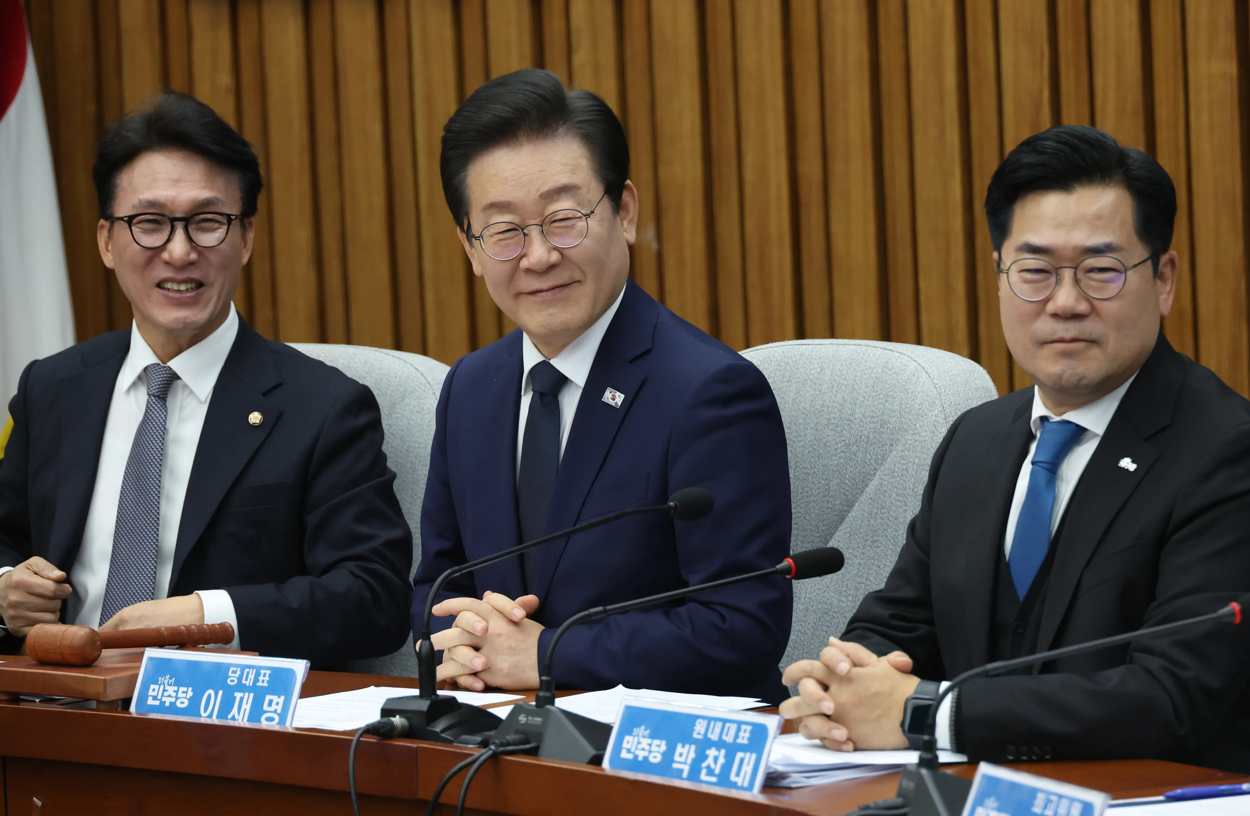 이재명(가운데) 더불어민주당 대표와 박찬대(왼쪽) 원내대표 등이 22일 국회에서 열린 제1차 확대간부회의에서 미소를 짓고 있다. 왼쪽부터 김민석 최고위원, 이 대표, 박 원내대표. 2024.11.22