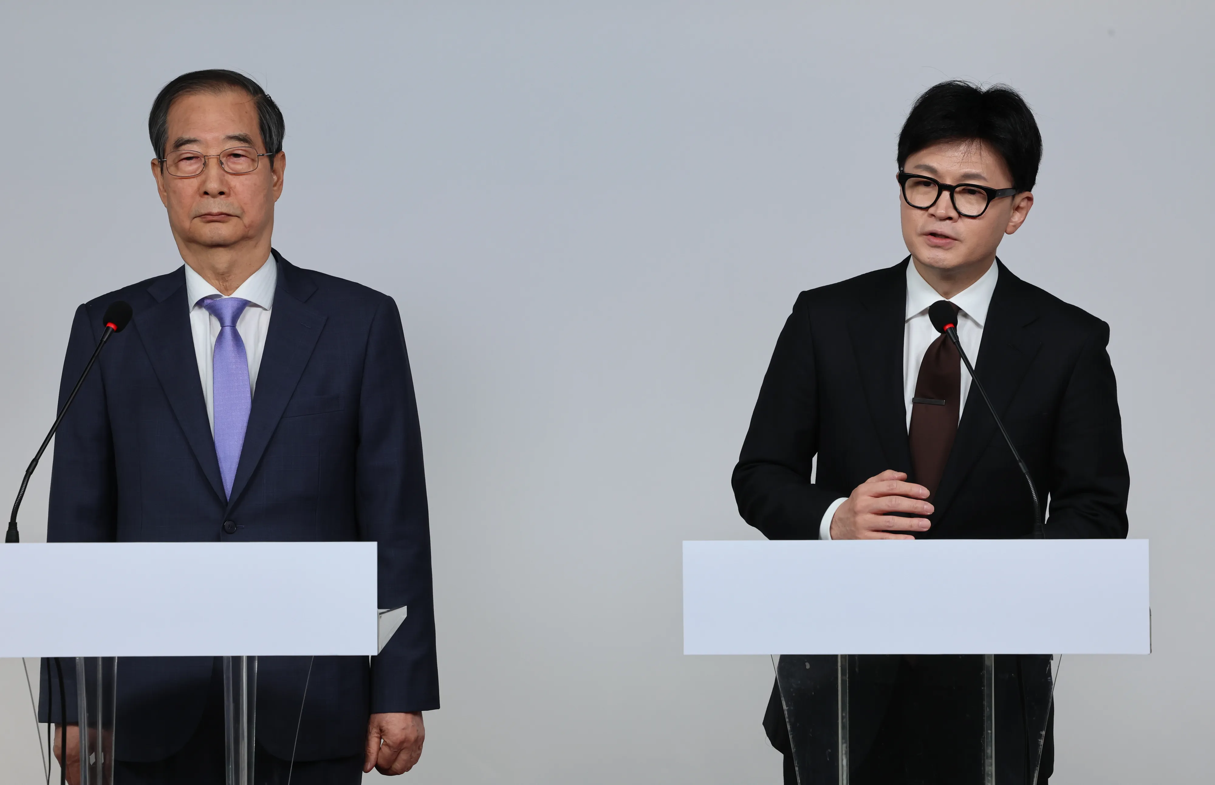 한덕수(왼쪽) 국무총리와 한동훈 국민의힘 대표가 8일 여의도 국민의힘 당사에서 국정 수습 방안을 담은 공동 담화문을 발표하고 있다. 2024.12.8