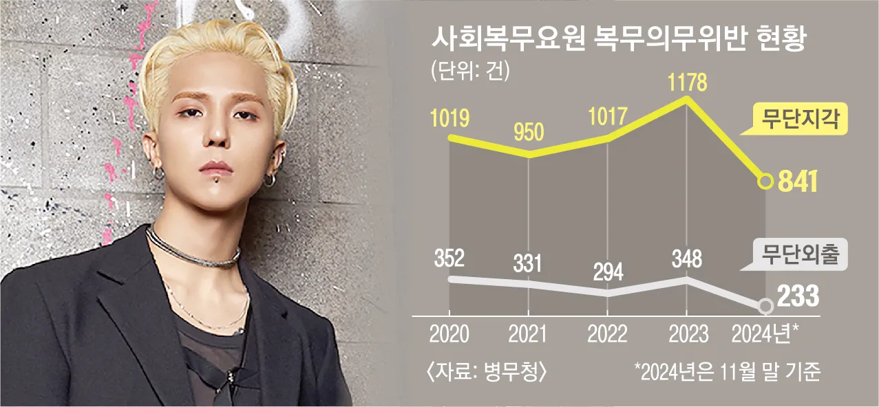 무단결근 등 복무이탈자도 2020년 853명에서 2023년 1087명으로 늘었다. 지난해 같은 기간 복무이탈자는 839명으로 집계됐다.