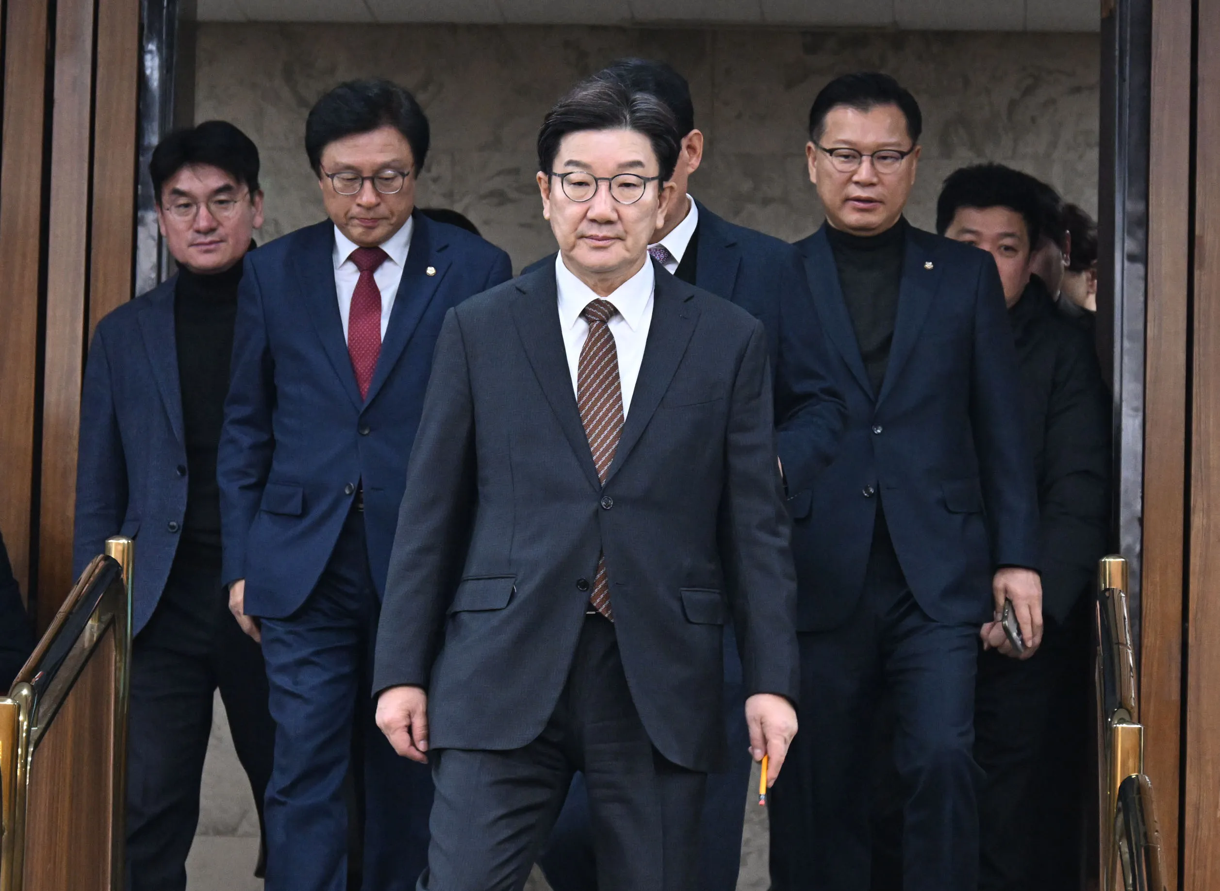 권성동(가운데) 국민의힘 원내대표가 7일 국회에서 열린 원내대책회의에 참석하기 위해 회의장으로 들어서고 있다. 권 원내대표는 “수사 권한이 없는 기관에서 받은 영장은 그 자체로 무효”라며 고위공직자범죄수사처의 영장 집행을 비판했다. 안주영 전문기자