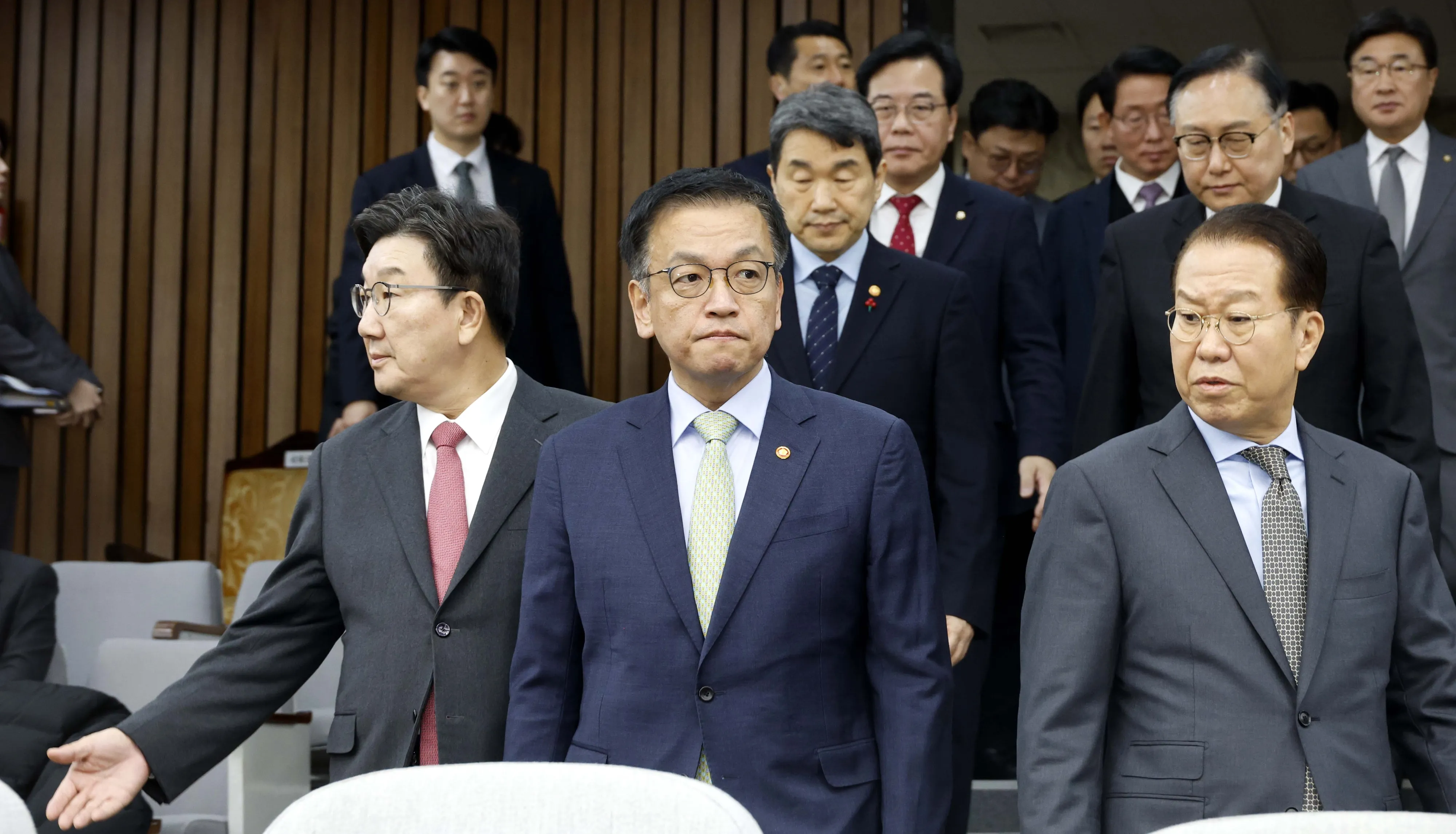 최상목(가운데) 대통령 권한대행 경제부총리 겸 기획재정부 장관과 권영세 국민의힘 비상대책위원장, 권성동 원내대표가 8일 국회에서 열린 ‘비상경제 안정을 위한 고위 당정협의회’에 참석하고있다. 국회사진기자단