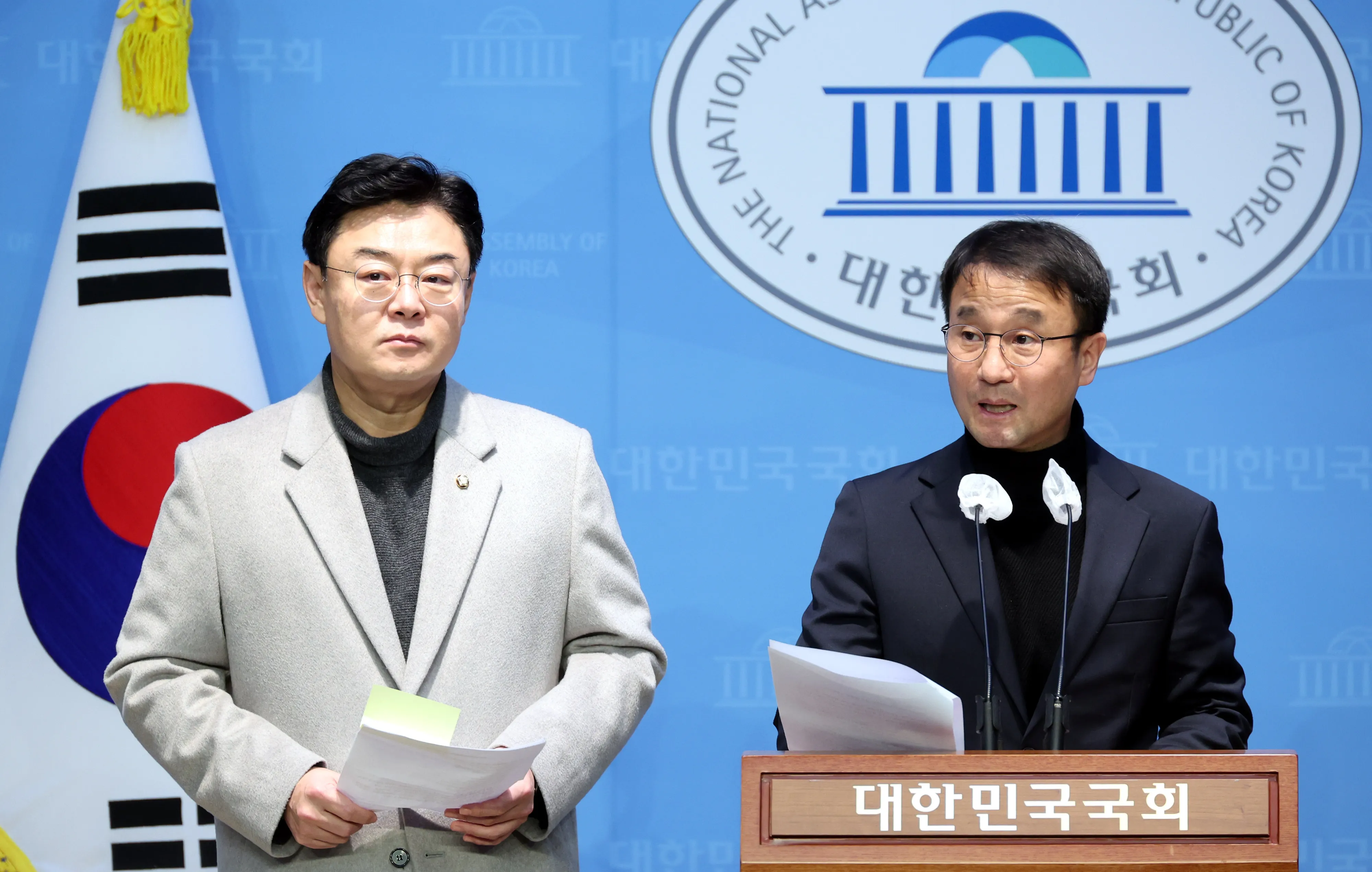 윤석열 정부의 비상계엄 선포를 통한 내란 혐의 진상규명 국정조사특별위원회 소속 국민의힘 김성원(오른쪽), 더불어민주당 한병도 간사가 21일 국회 소통관에서 합동참모본부 지휘통제실과 수도방위사령부 문서고 현장 조사 결과에 대해 브리핑하고 있다. 2025.1.21