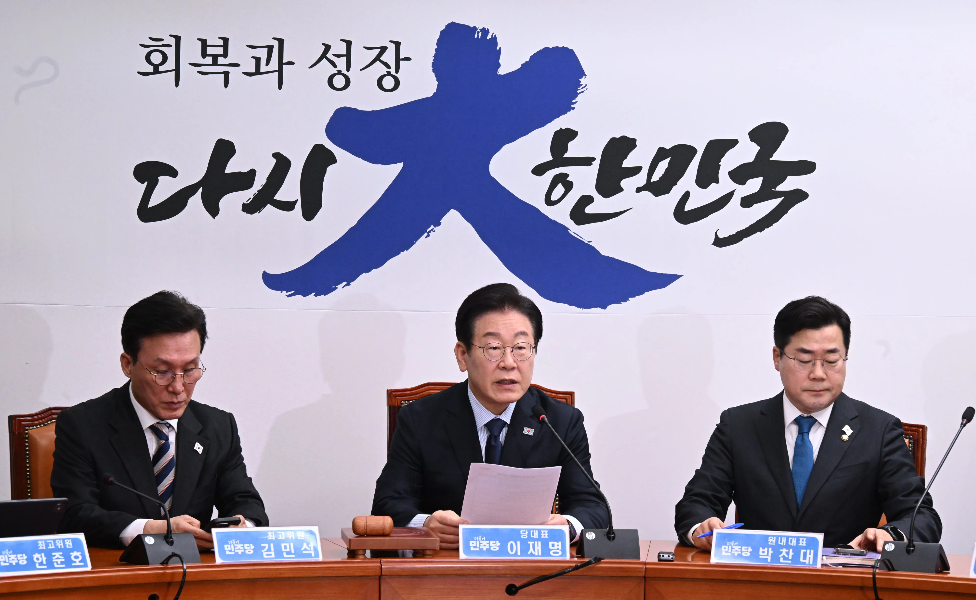 이 대표는 또 글로벌 통상 전쟁에 대비한 초당적 통상 특위 구성도 제안했다. 이 대표는 “국회에 통상 특위를 만들어서 초당적으로 대비할 것을 제안한다”며 “(국민의힘이) 또 불필요한 핑계를 대면서 빠져나가지 않기를 바란다”고 했다.