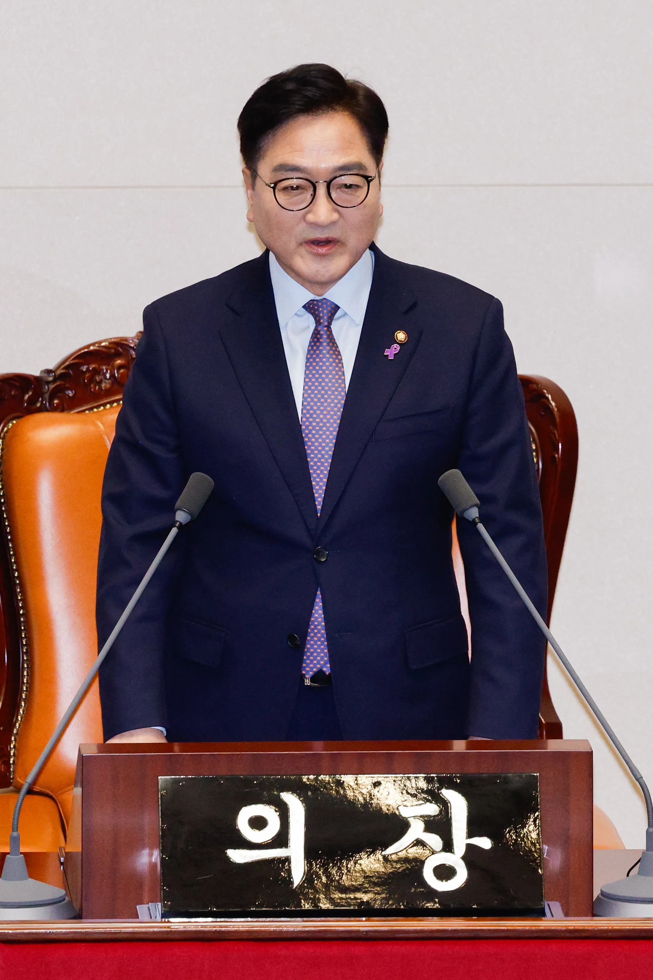 우원식 국회의장이 지난 3일 국회 본회의장에서 열린 제422회 국회(임시회) 개회식에서 개회사를 하고 있다. 2025.2.3