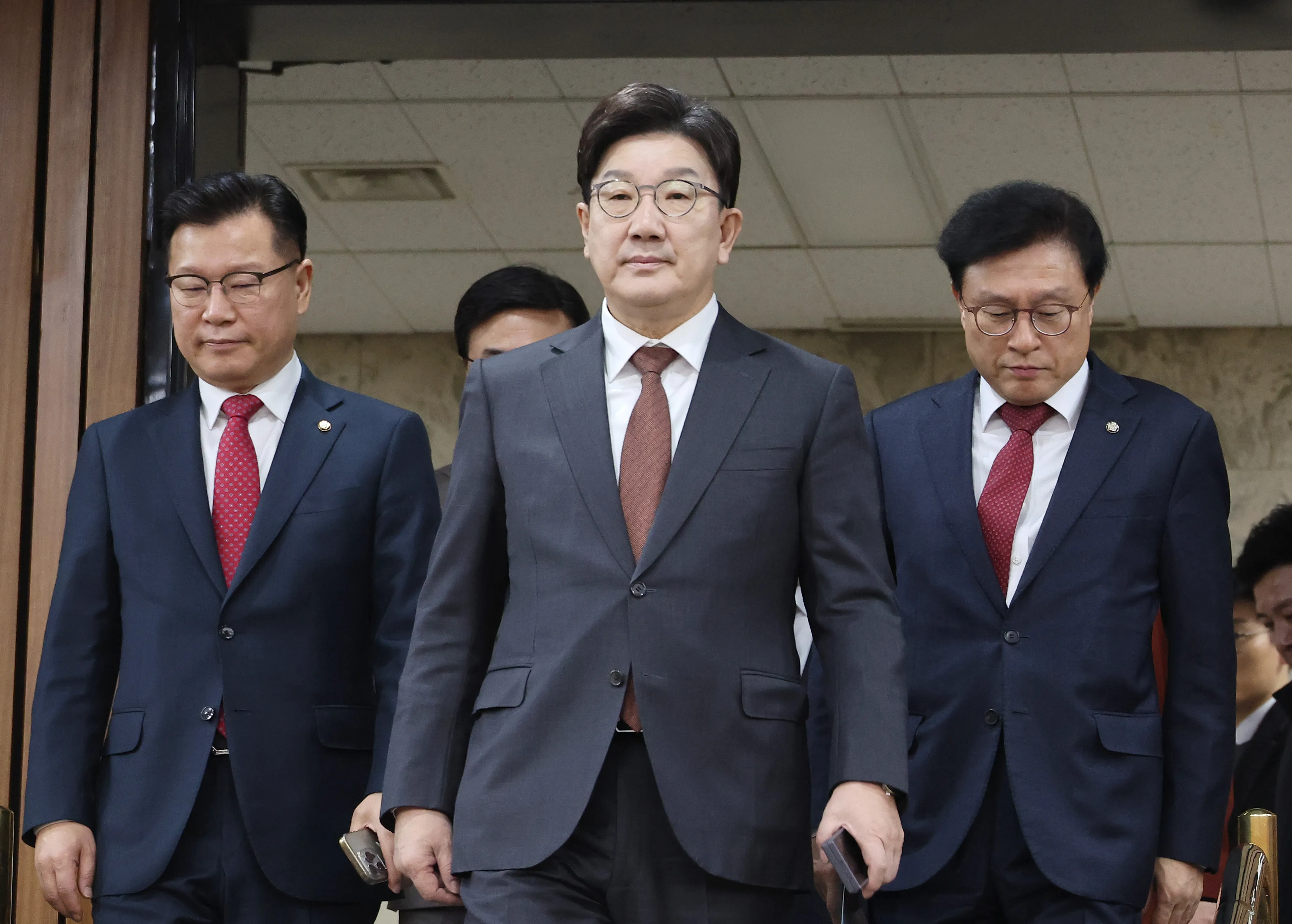 권성동(가운데) 국민의힘 원내대표가 7일 서울 여의도 국회에서 열린 원내대책회의에 참석하고 있다. 왼쪽은 이양수 사무총장, 오른쪽은 박형수 원내수석부대표. 연합뉴스