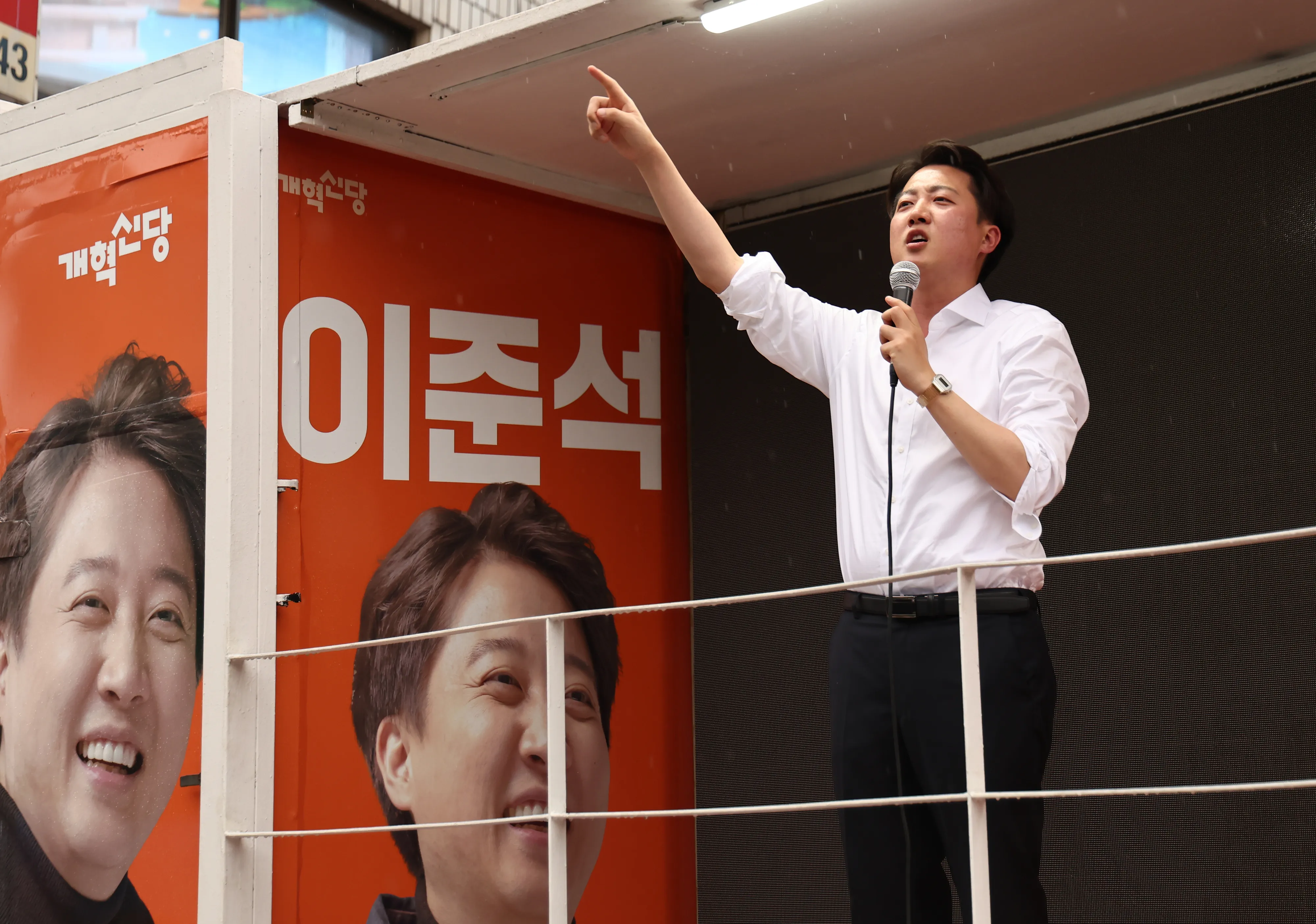 이준석 개혁신당 대선 후보가 16일 충남 천안중앙시장에서 유세차량에 올라 발언하고 있다. 천안 연합뉴스