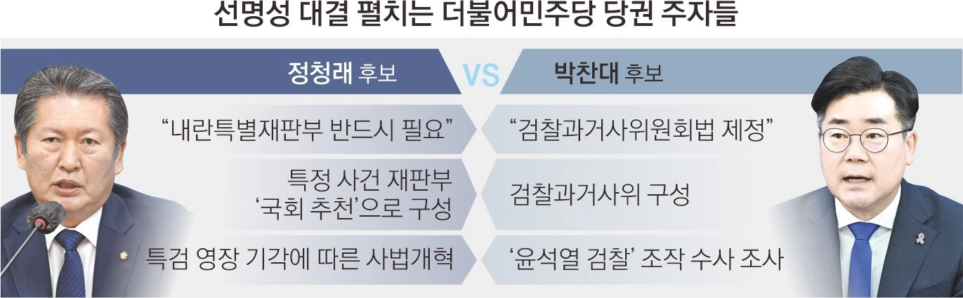 8·2 전당대회를 앞두고 더불어민주당 당권 주자들의 ‘선명성 대결’이 치열하게 전개되고 있다. 정청래 후보는 사법부를 압박하는 내란특별재판부의 필요성을, 박찬대 후보는 ‘윤석열 정권의 검찰’을 겨냥한 검찰과거사위원회법 제정을 언급하며 개혁 성향이 강한 권리당원 표심 공략에 나섰다.