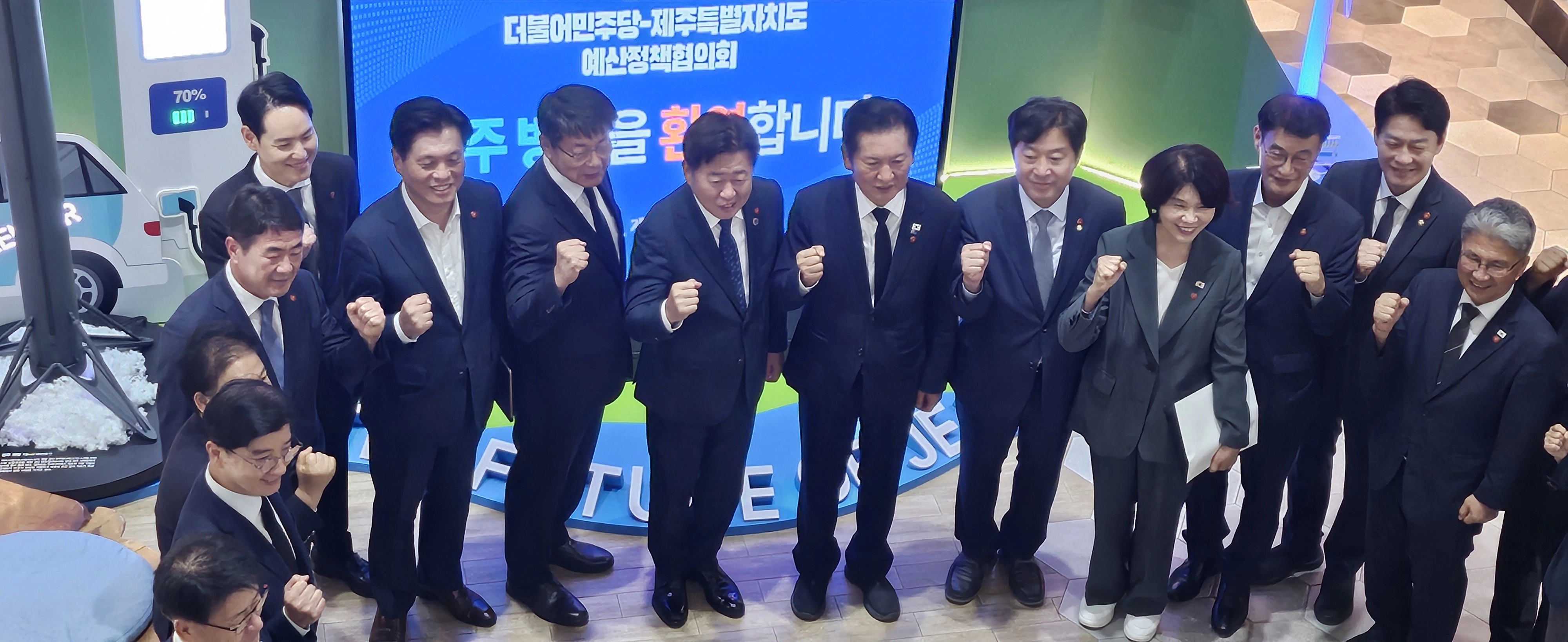 또한 “내년도 예산에 제주가 2조 3010억원을 확보한 것은 반가운 소식”이라며 “가파도 RE100 마을 조성, 수소차 보급 등 이재명 대통령이 약속한 재생에너지 모범도시 비전이 반영돼 제주가 탄소중립과 에너지 전환의 선도지역으로 자리매김하는 데 앞으로 큰 역할을 할 것”이라고 말했다.