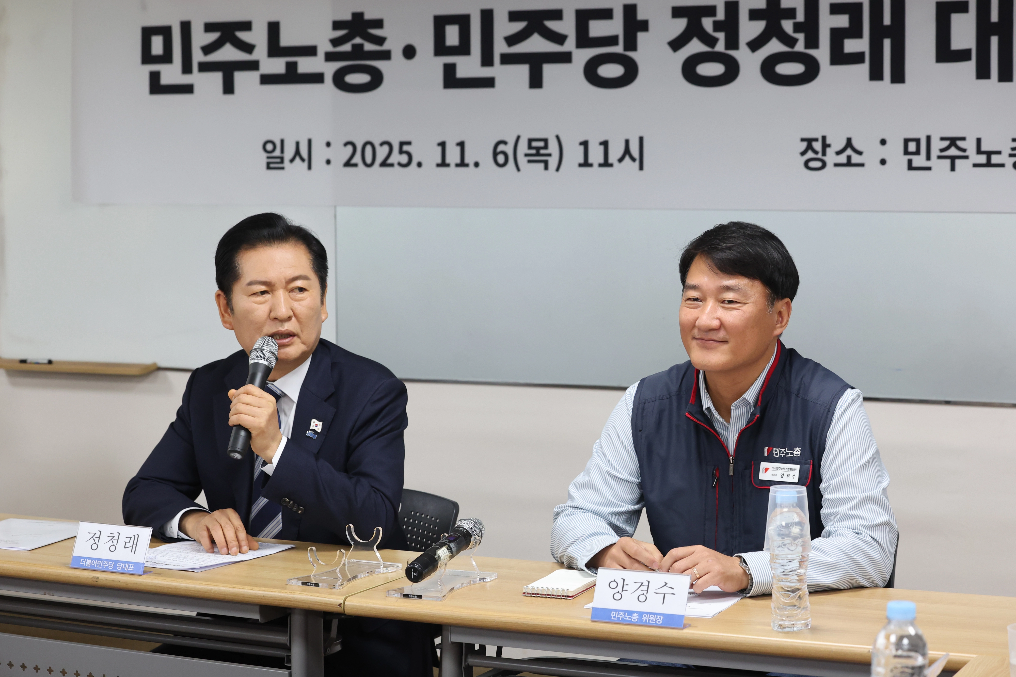 정 대표는 이날 서울 중구 민주노총 사무실에서 열린 민주노총·민주당 정책협의회에서 “민주노총 조합원들께도 분명히 말씀드릴 것은 이재명 정부는 좀 다를 것”이라며 “노동자와 노동조합은 이재명 정부의 가장 강력한 지지 세력이며 민주당의 영원한 동반자”라고 강조했다.
