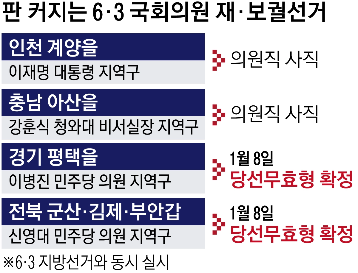 이로써 오는 6월 3일 재·보선이 확정된 지역은 이재명 대통령과 강훈식 청와대 비서실장의 의원직 사직으로 보궐선거가 치러지는 인천 계양을과 충남 아산을에 더해 4곳으로 늘어났다.