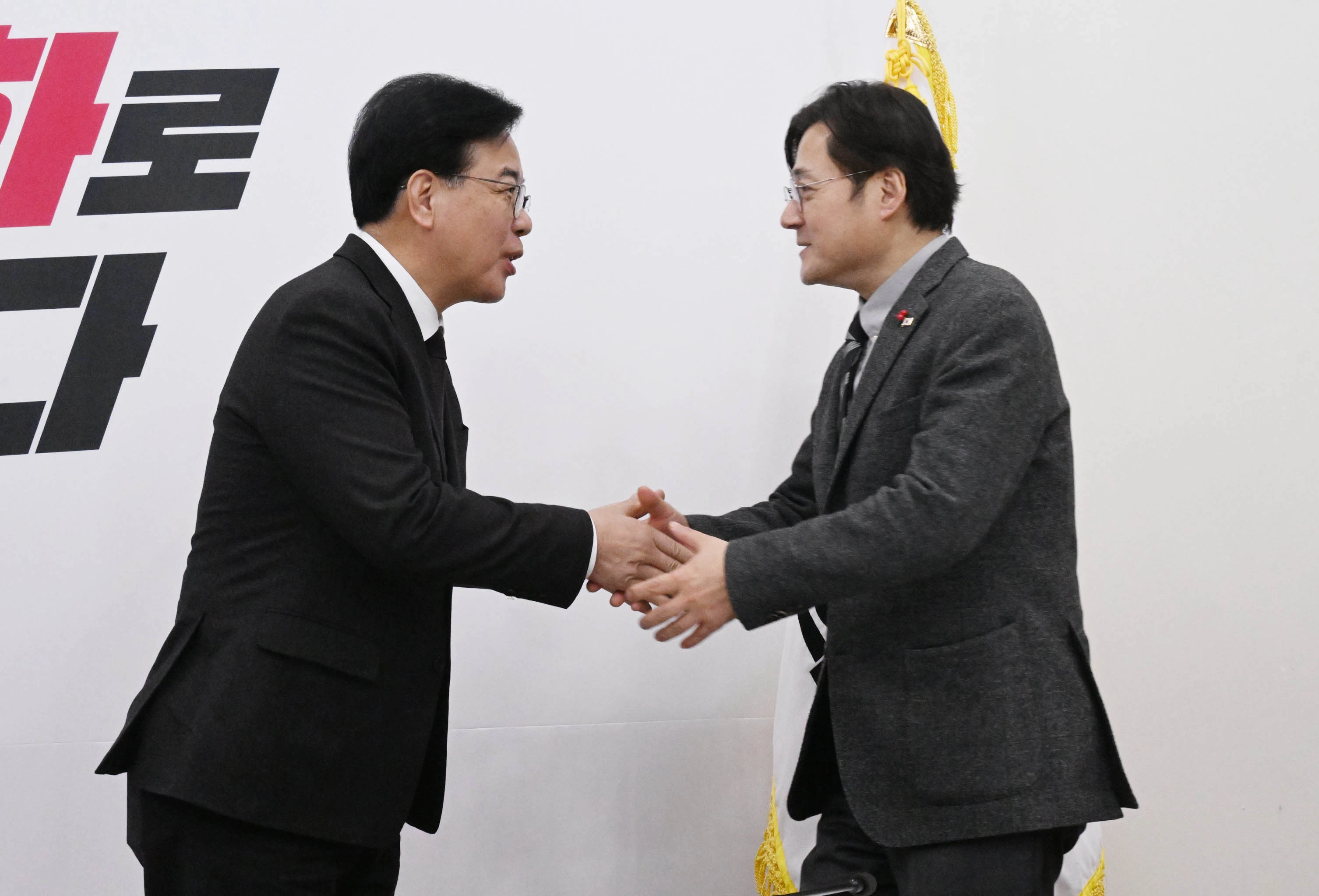 송언석 국민의힘 원내대표가 22일 오후 서울 여의도 국회에서 홍익표 대통령비서실 정무수석을 접견하며 악수를 하고 있다.