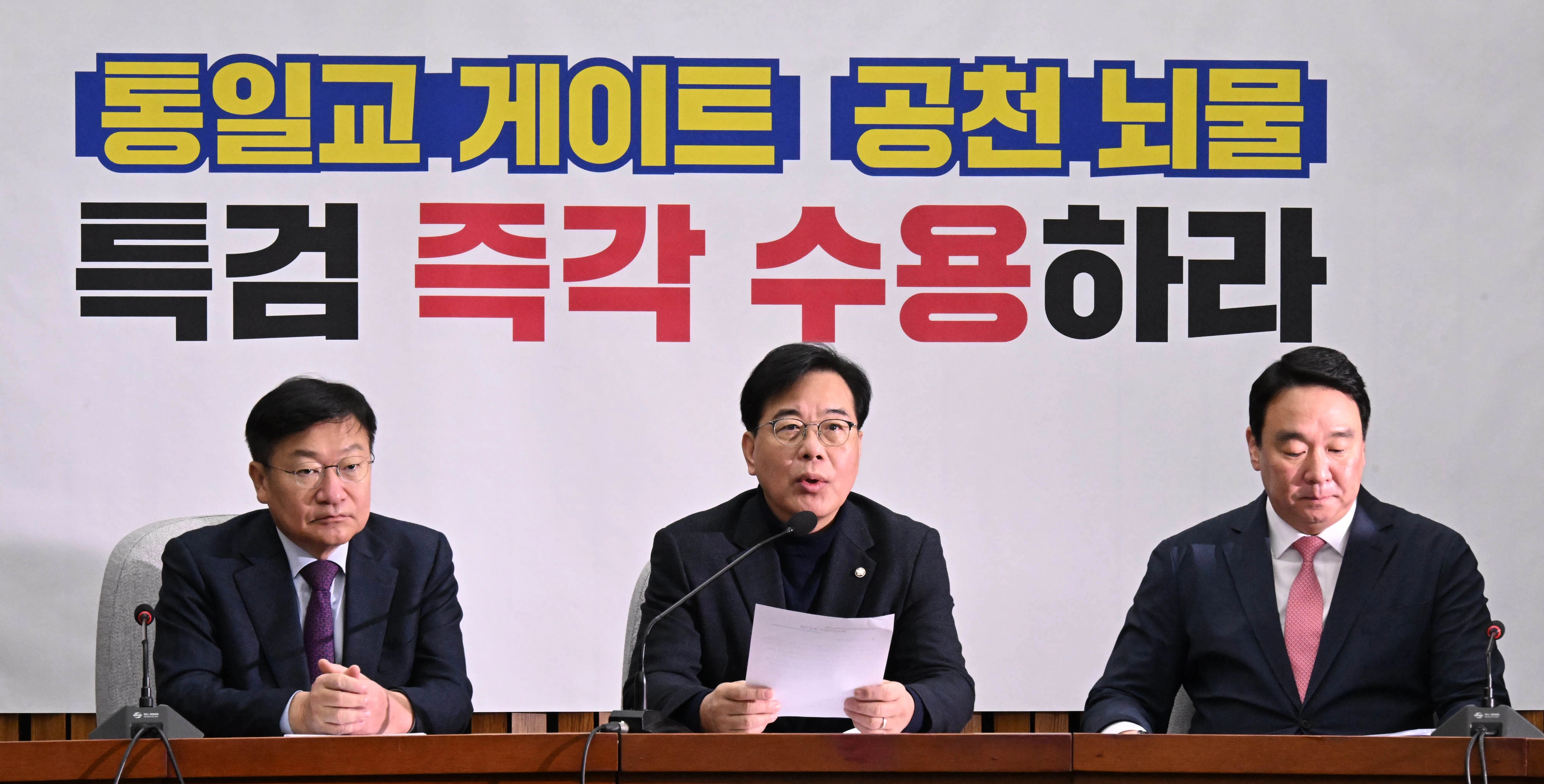 송언석 국민의힘 원내대표가 27일 국회에서 열린 원내대책회의에서 발언하고 있다.