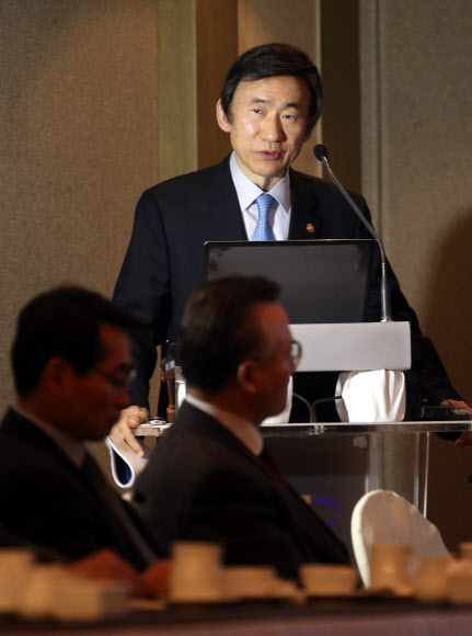 윤병세 외교부 장관이 28일 오전 서울 중구 소공로 플라자호텔에서 열린 한반도경제포럼에서 한반도 정세와 평화해법 모색을 주제로 강연을 하고 있다.