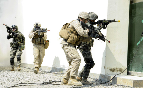 이번 훈련에는 한·미 해병대원 100여명이 참가해 포항시 남구 장기면 도시지역 전투훈련장에서 이동, 건물진입, 내부소탕, 화기운용 등 실제 전장의 상황을 시범교육 형태로 진행했다.