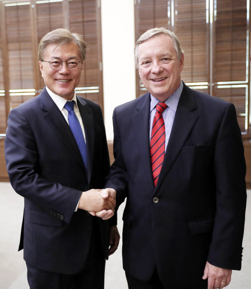 미국 민주당 상원 원내총무와 악수하는 문 대통령  문재인 대통령(왼쪽)이 31일 오후 청와대 여민관에서 예방한 더빈 미국 민주당 상원 원내총무와 악수하고 있다. 2017.5.31 [청와대 제공 = 연합뉴스]