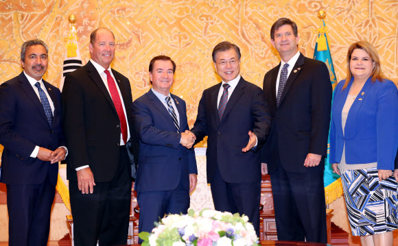 문 대통령은 이날 이들 일행을 접견한 자리에서 “북한의 핵과 미사일 도발에 대해 입법을 통해 북한에 강력한 제제·압박을 하면서도 외교적인 해결의 메시지를 던지고 계셔서 감사드린다”면서 “한국의 입장에 대해 지지하고 격려해주신 것에 감사드린다”고 거듭 사의를 표했다.
