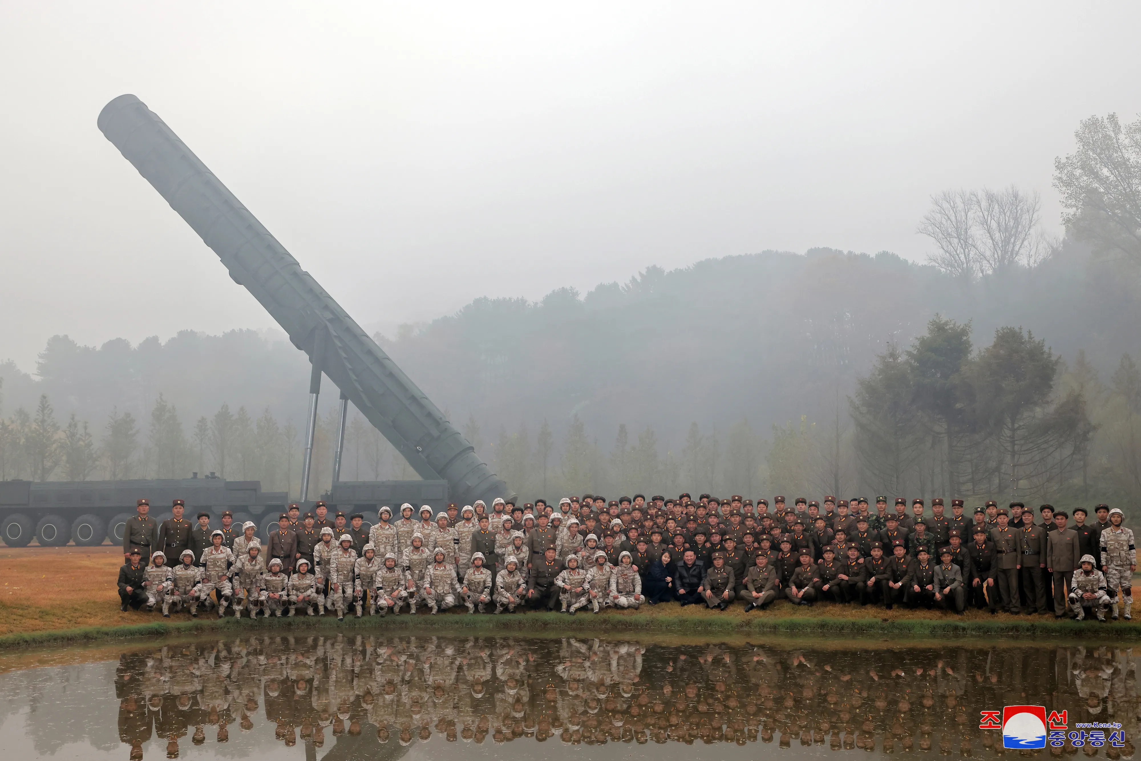 김정은(앞줄 가운데) 북한 국무위원장과 딸 주애가 지난달 31일 신형 대륙간탄도미사일(ICBM) ‘화성-19형’ 시험 발사에 성공한 뒤 이동식 발사대(TEL) 앞에서 부대원들과 함께 기념사진을 찍고 있는 모습. 조선중앙통신은 시험 발사 소식을 전하며 이 사진을 지난 1일 공개했다. 평양 조선중앙통신·연합뉴스