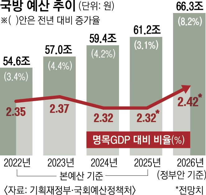 정부는 “감당할 수 있으니 약속한 것”이라는 입장이다. 기재부 예산실 관계자는 “국방 예산은 국가 안보와 관련돼 있어 지출 증가율 등락이나 복지·고용 등 민생 예산과 무관하게 일정 비율을 유지해 왔다”고 했다.