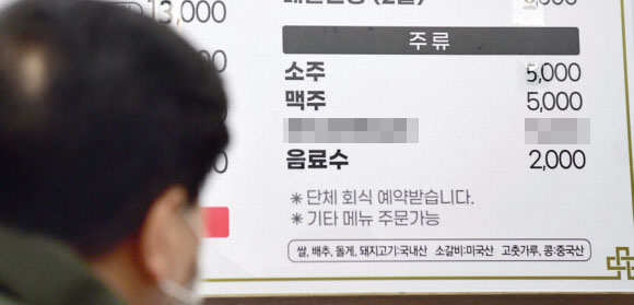 2일 서울 시내 한 식당 차림표에 소주 가격이 5000원으로 수정돼 있다. 정연호 기자