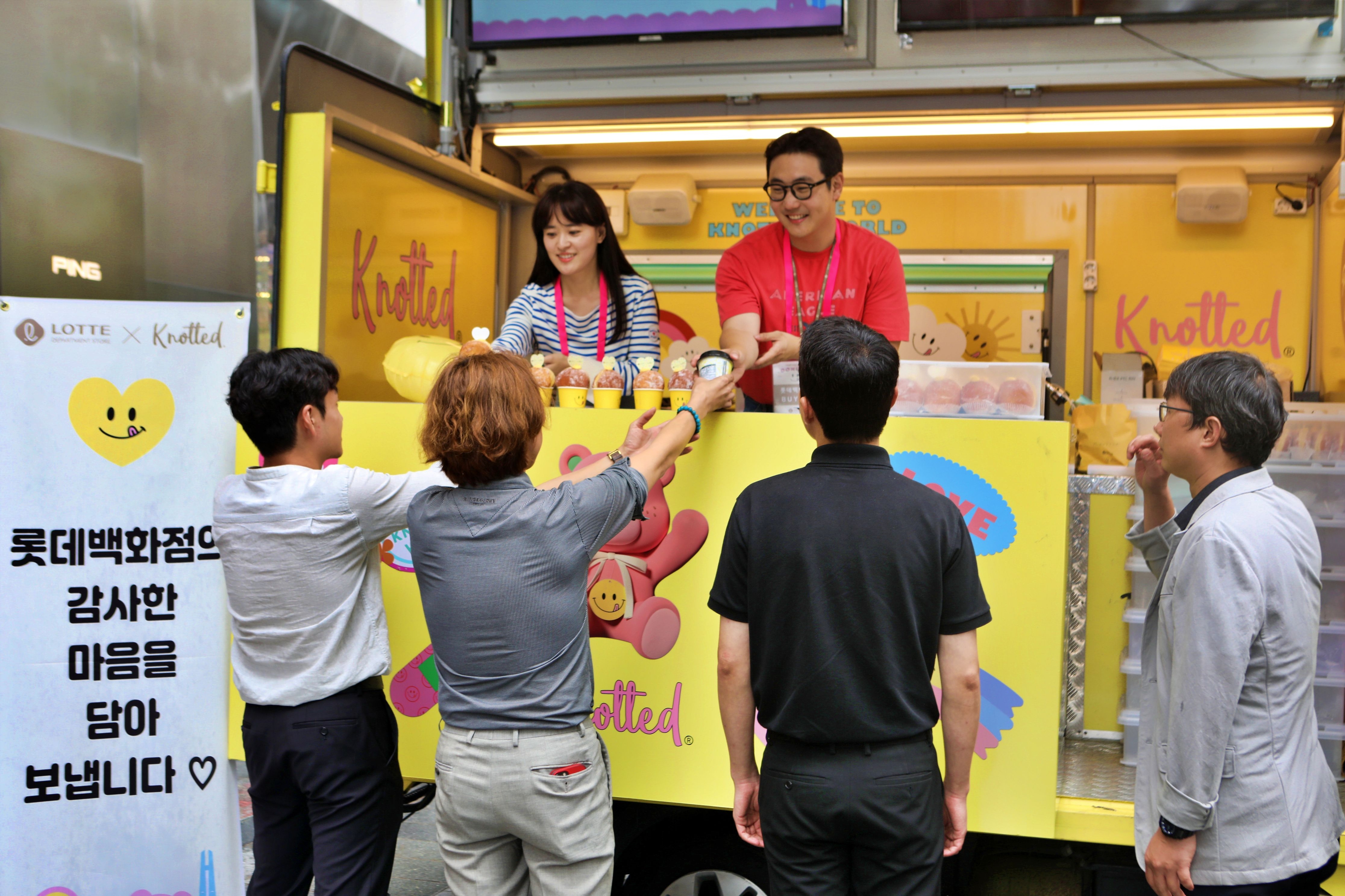 롯데백화점이 마련한 커피차에서 파트너사 임직원들이 간식을 받아가고 있다. 롯데백화점 제공