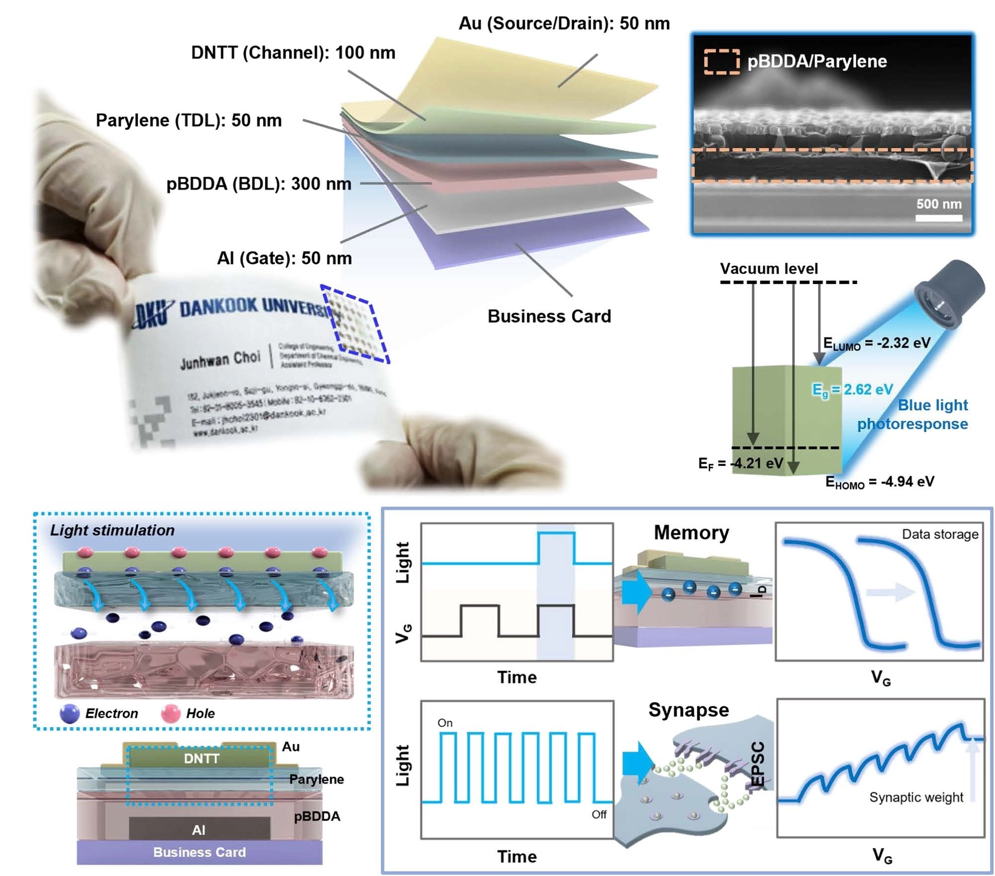 연구팀은 트랜지스터 소자에 이중 절연막 구조를 도입해, 고분자 절연층 사이 빛에 의해 생성된 전하를 포획·저장하는 구조를 구현했다.