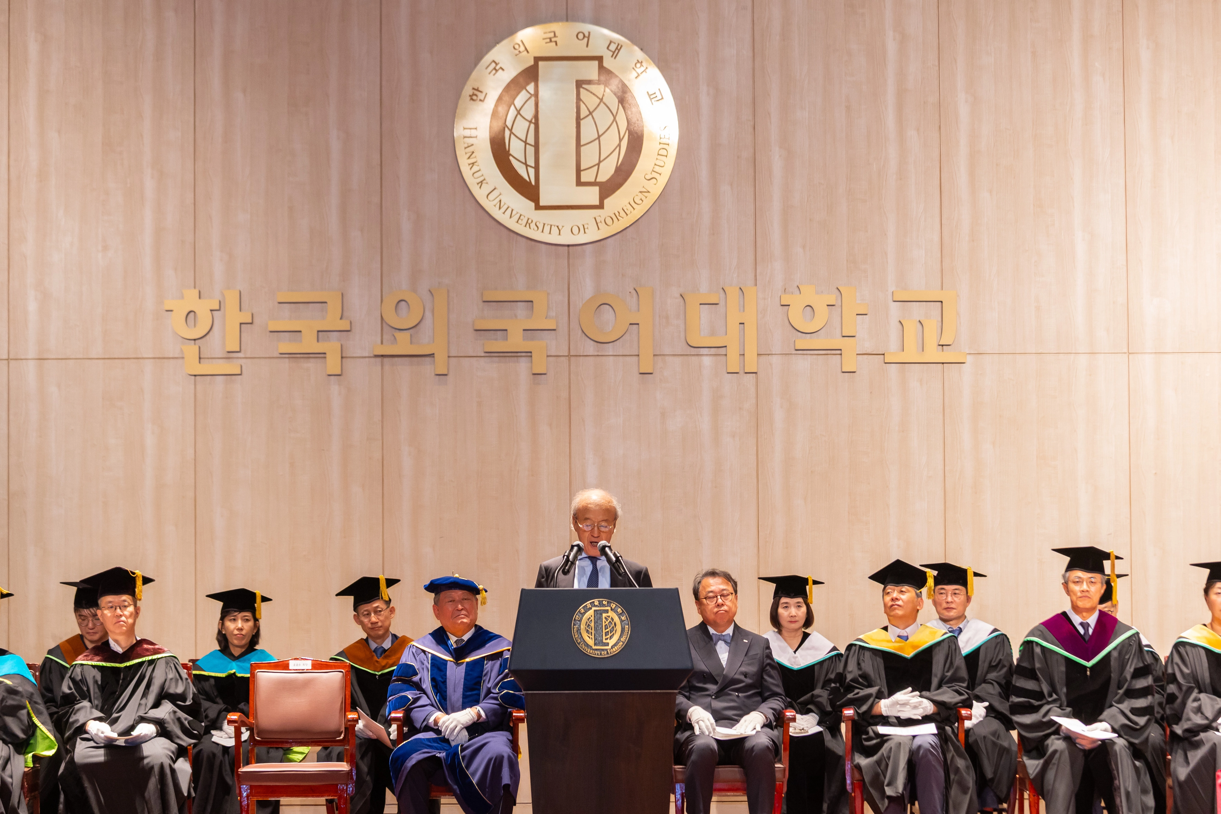 한국외국어대학교는 지난 22일 서울‧글로벌 양 캠퍼스에서 2025년 후기 학위수여식을 개최했다. 서울캠퍼스 행사에는 지난 7월 본교에서 명예 경영학박사 학위를 받은 윤윤수 미스토홀딩스 회장이 모교를 다시 찾아 졸업생 후배들에게 축사를 전하며 큰 주목을 받았다.